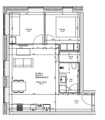 3 vær. lejlighed på 80 m²