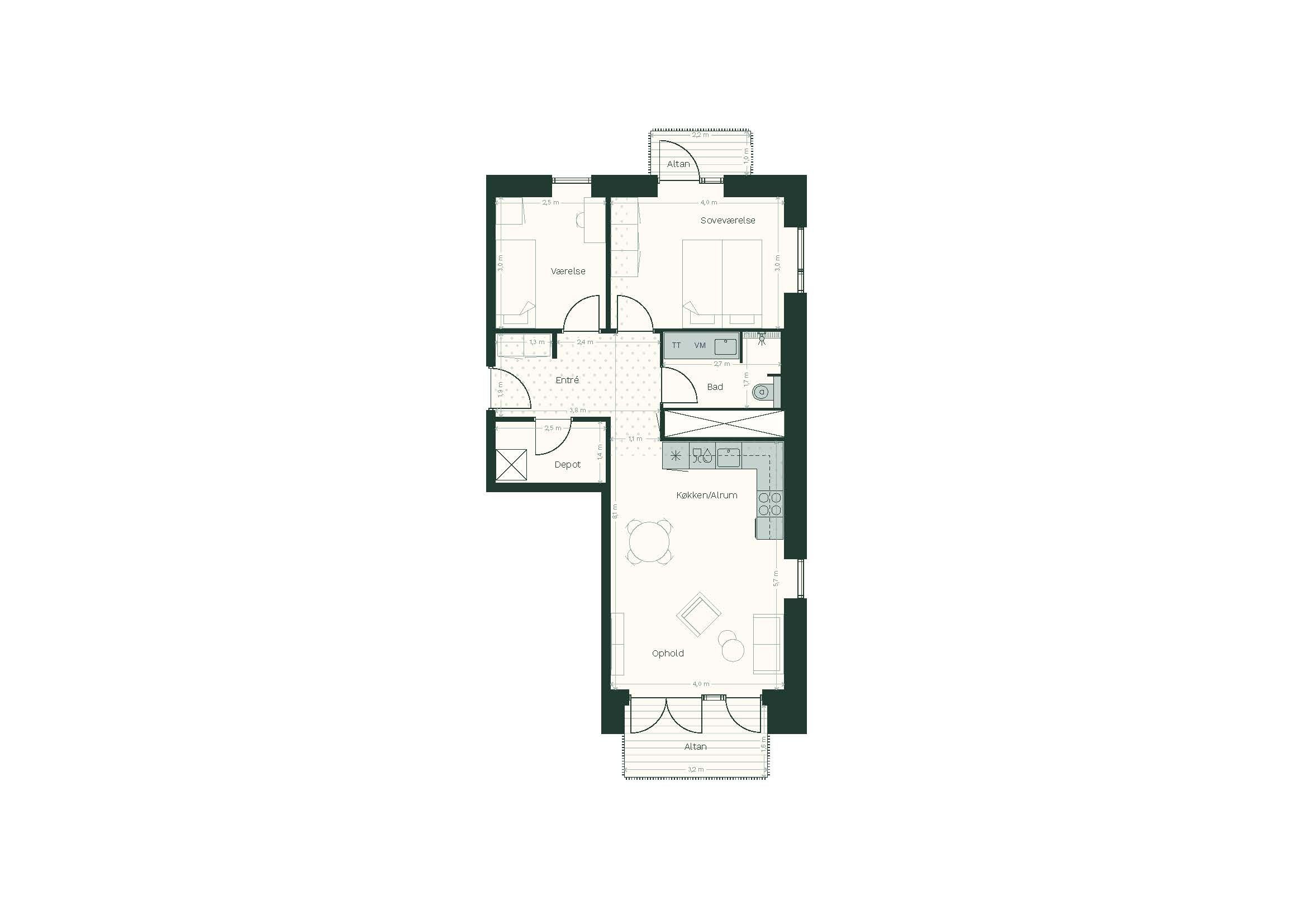 3 vær. lejlighed på 80 m²