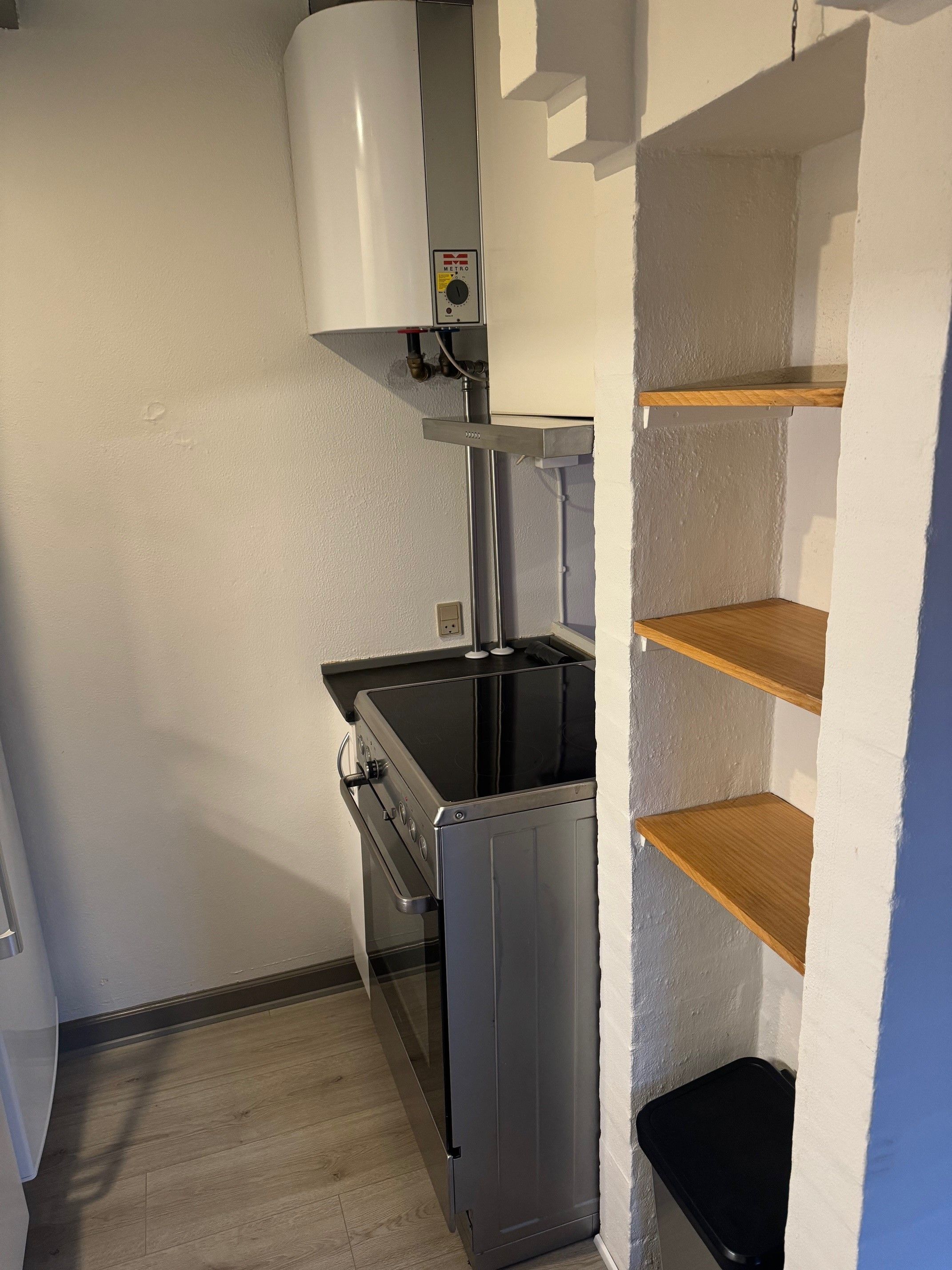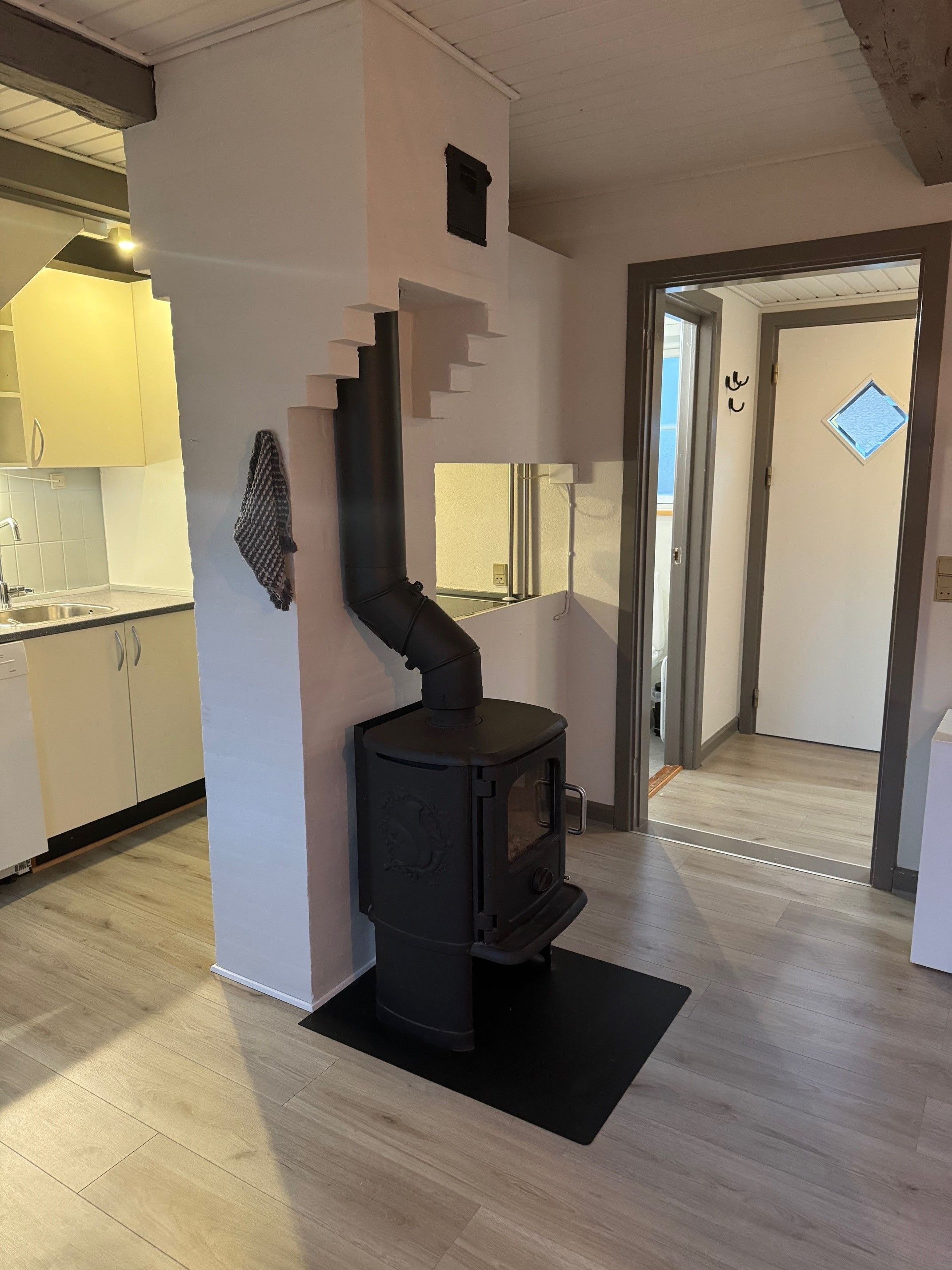 Lejligheden har egen indgang og indeholder: Stueetage: indgang, soveværelse, bryggers med mulighed for tilslutning af vaskemaskine og badeværelse. Trappe til 1. sal med køkken/alrum/stue. Køkkenet er med komfur og køleskab. Der er én P-plads til lejligheden og adgang til fælles have.