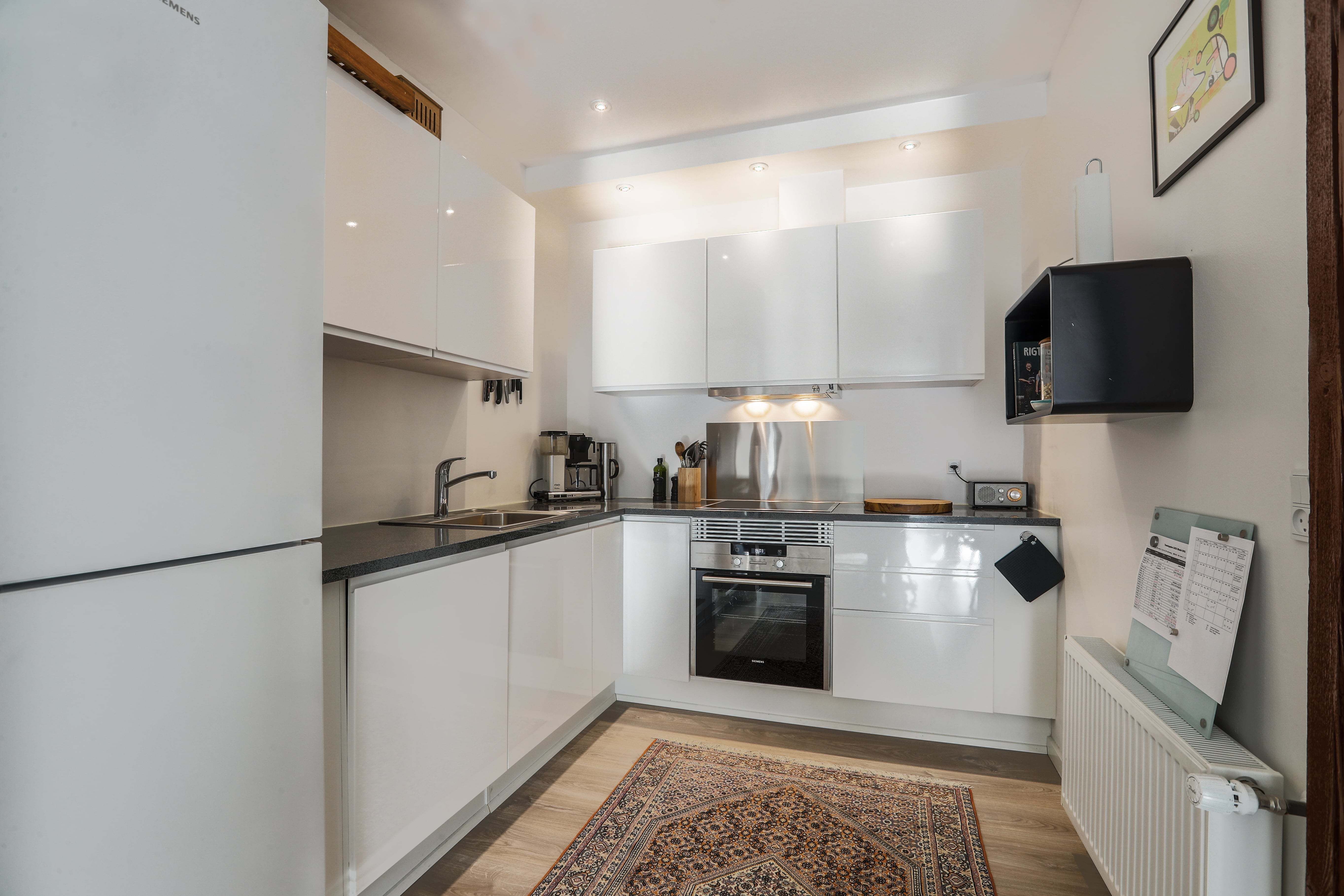 I køkkenet er der masser af både bordplads og skabsplads, og lejligheden indeholder følgende hårde hvidevarer:
