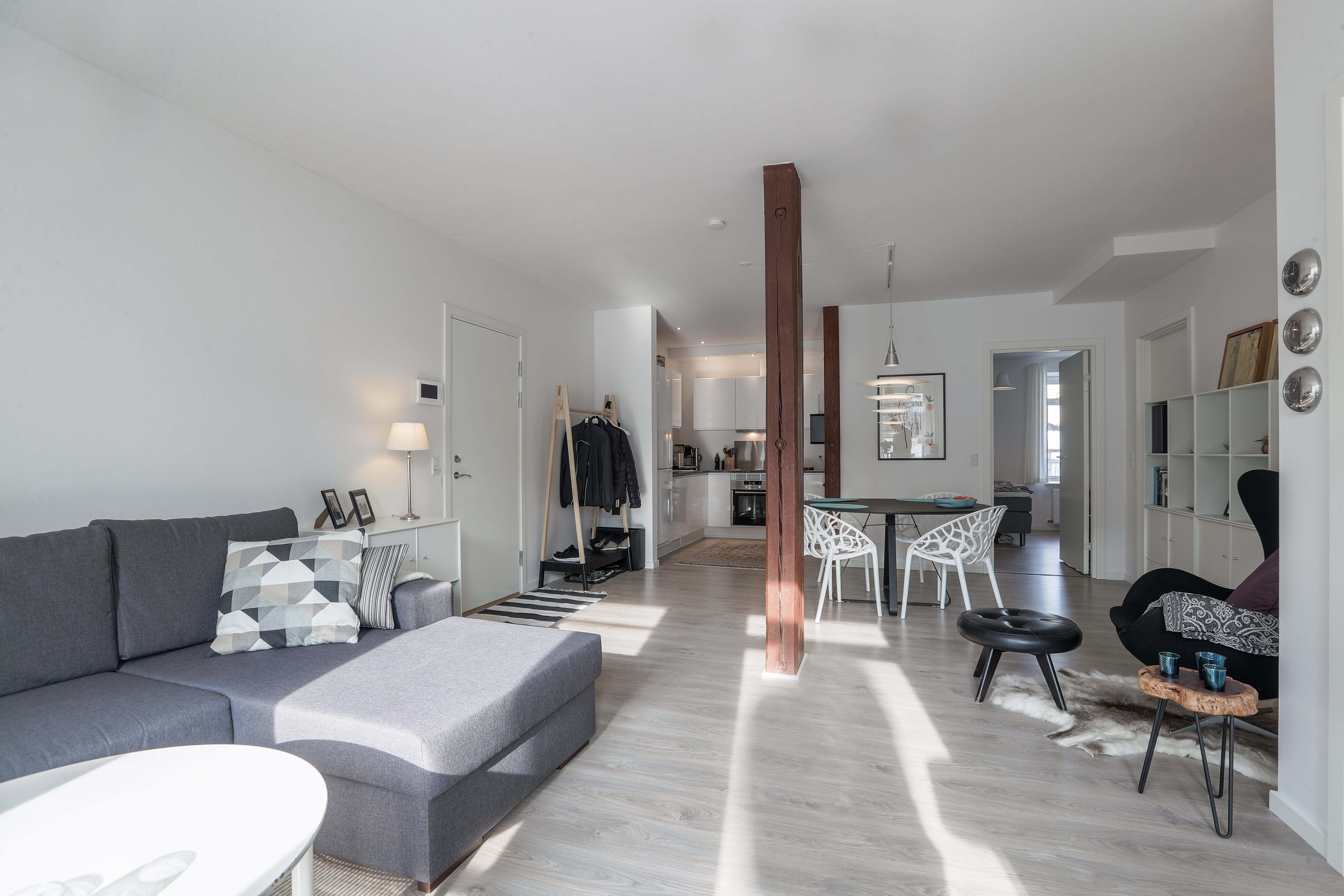 Lejligheden er indrettet med fordelingsgang, hvorfra der er adgang til køkkenet, soveværelset, badeværelserne samt stuen. Herudover er der ligeledes adgang til værelset fra stuen. Dette er en skøn lys lejlighed, hvor der er et fantastisk lysindfald i både stuen og værelserne.