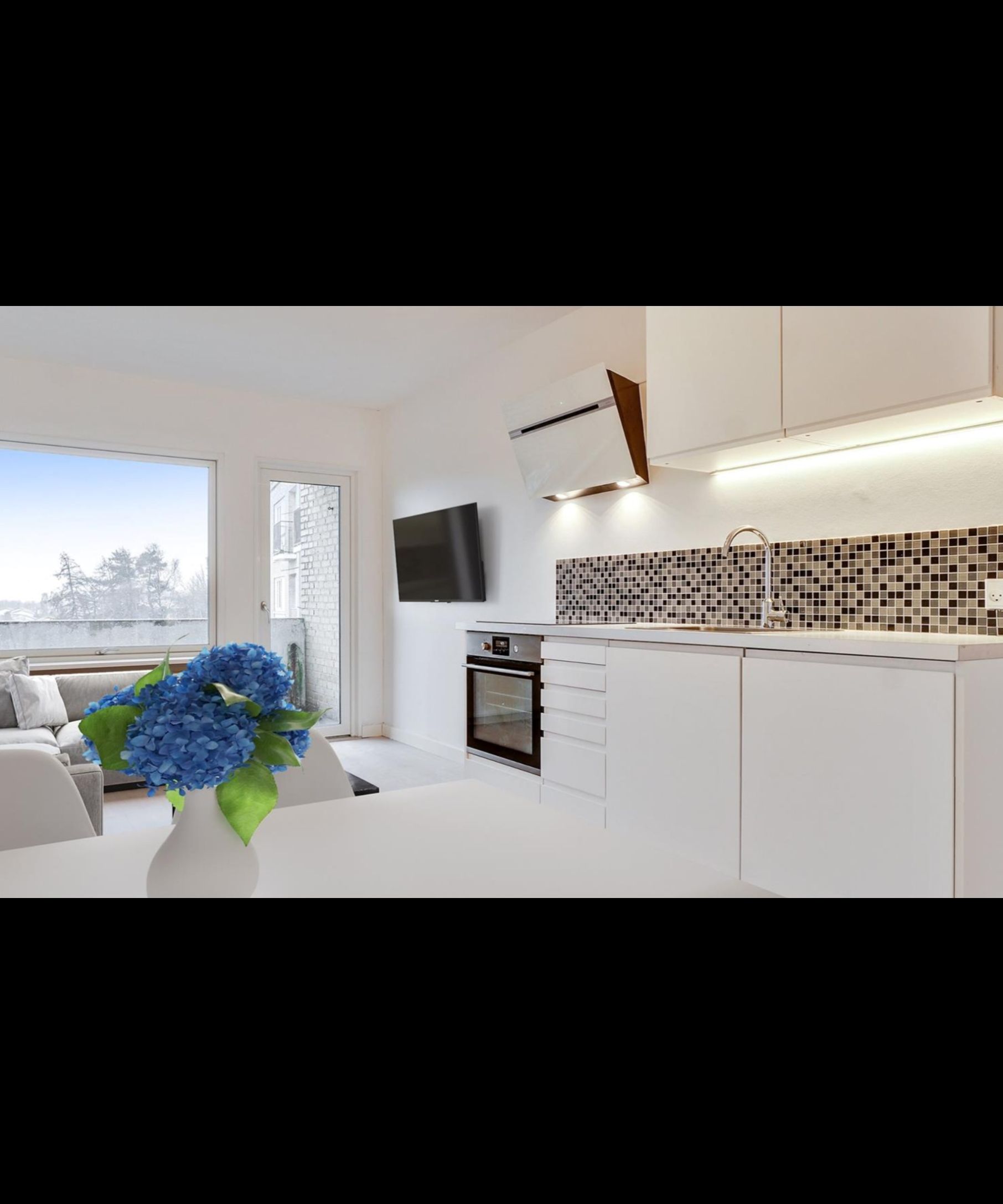 Lys 1-værelses med terrasse, beliggende ved fjord og natur
