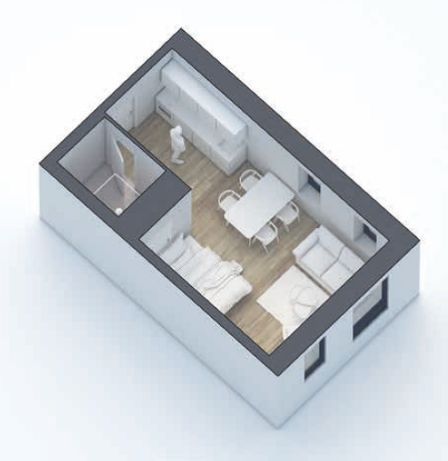 1-værelses lejlighed med lyse trægulve. Der er entre med indbygget skab, badeværelse med badekar og brus, stue med køkken med 2 kogeplader og køleskab samt alkove. Der er fælles gratis vaskeri og stor tagterrasse.