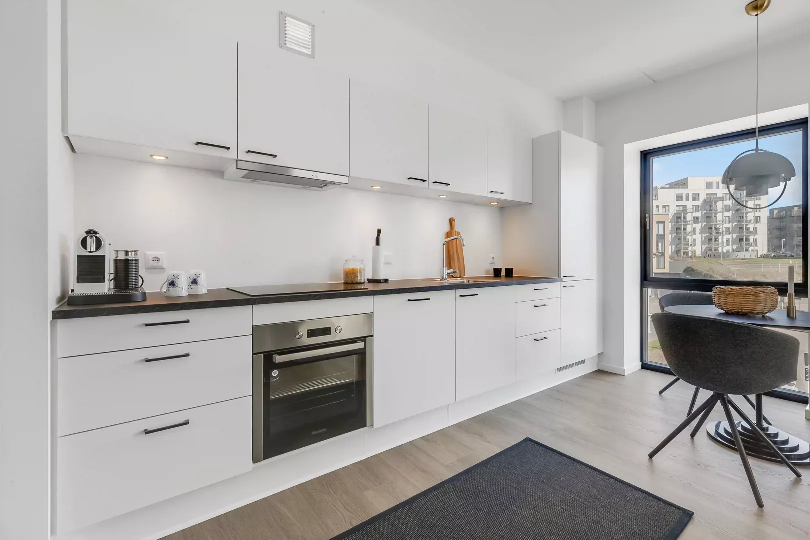Fra den lidt lange entré bevæger man sig ind i resten af lejligheden, som er et mindre køkken alrum med opvaskemaskine i det flotte hvide køkken og store vinduer, der lyder rummet op. Der er udgang til en stor altan fra køkken alrummet. Til sidst er der soveværelset, som ligeledes har store vinduer og har et dobbelt klædeskab.