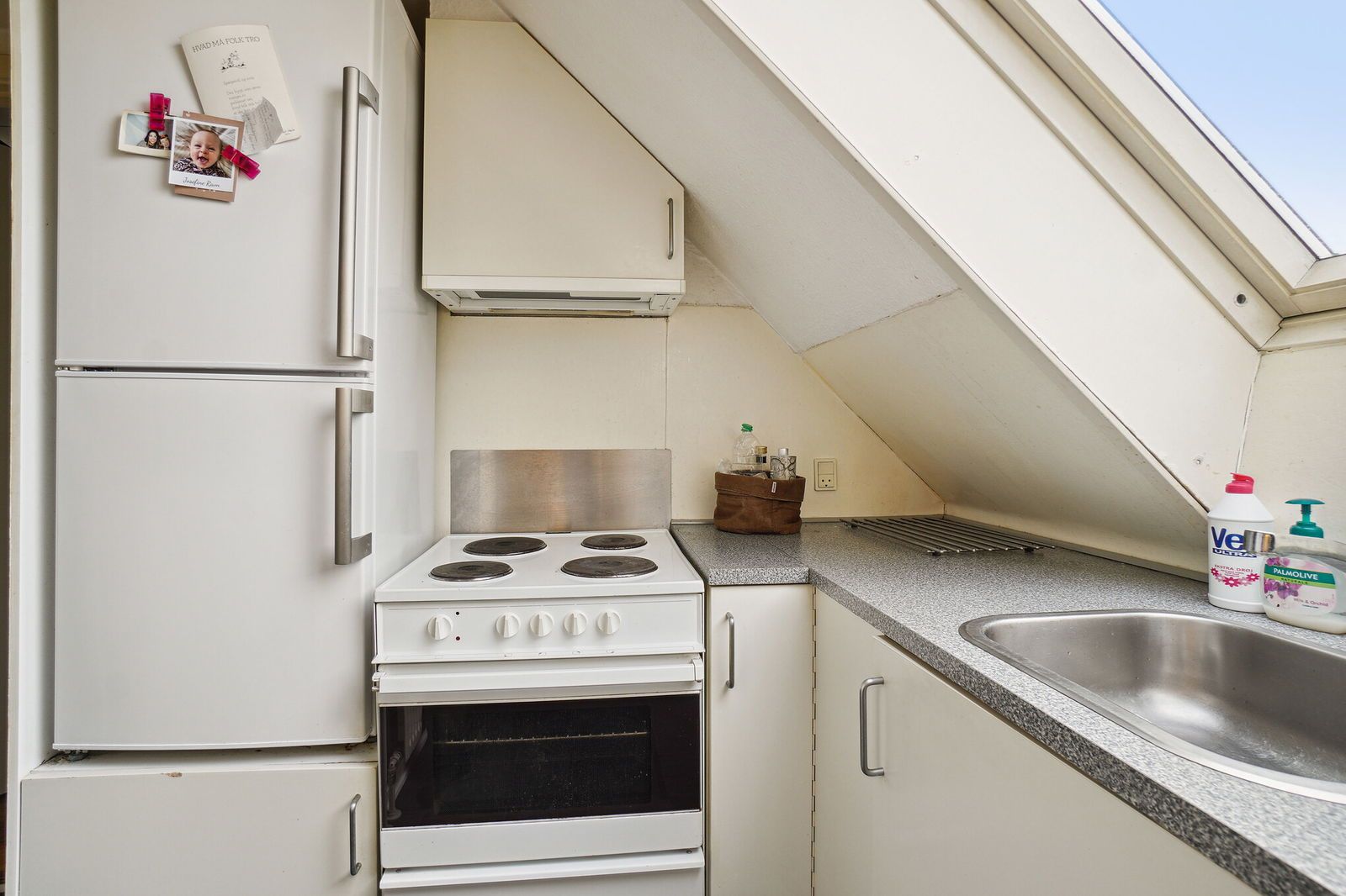 Et pænt og funktionelt køkken med komfur, køle-/fryseskab og opvaskemaskine