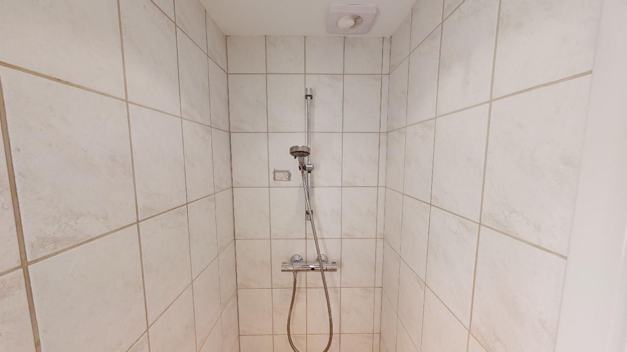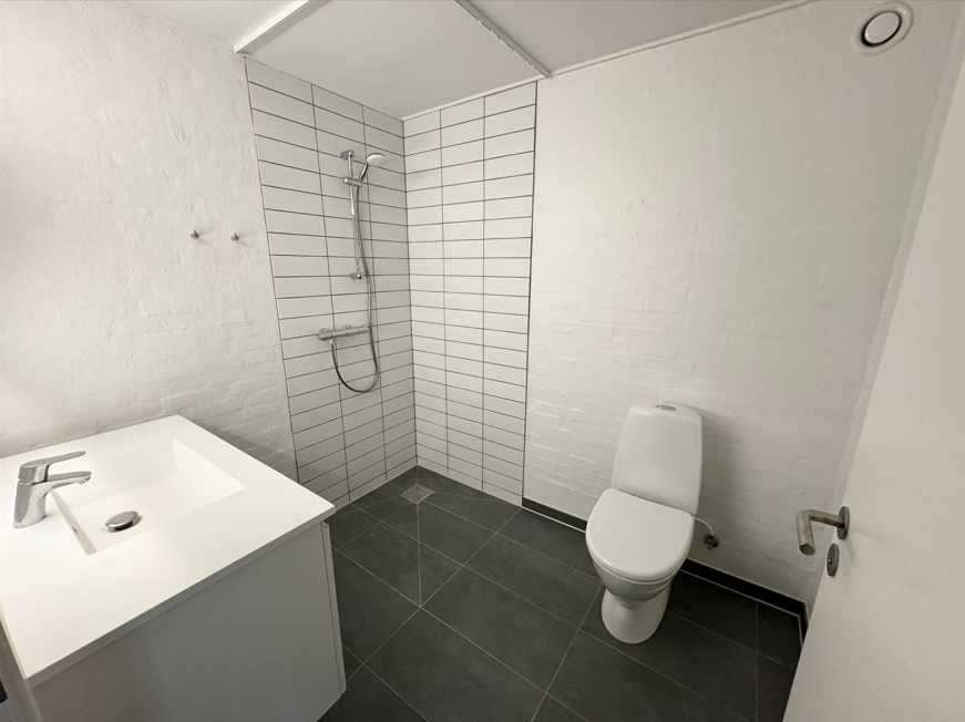 Et badeværelse med muret bruseniche samt egen vaskemaskine