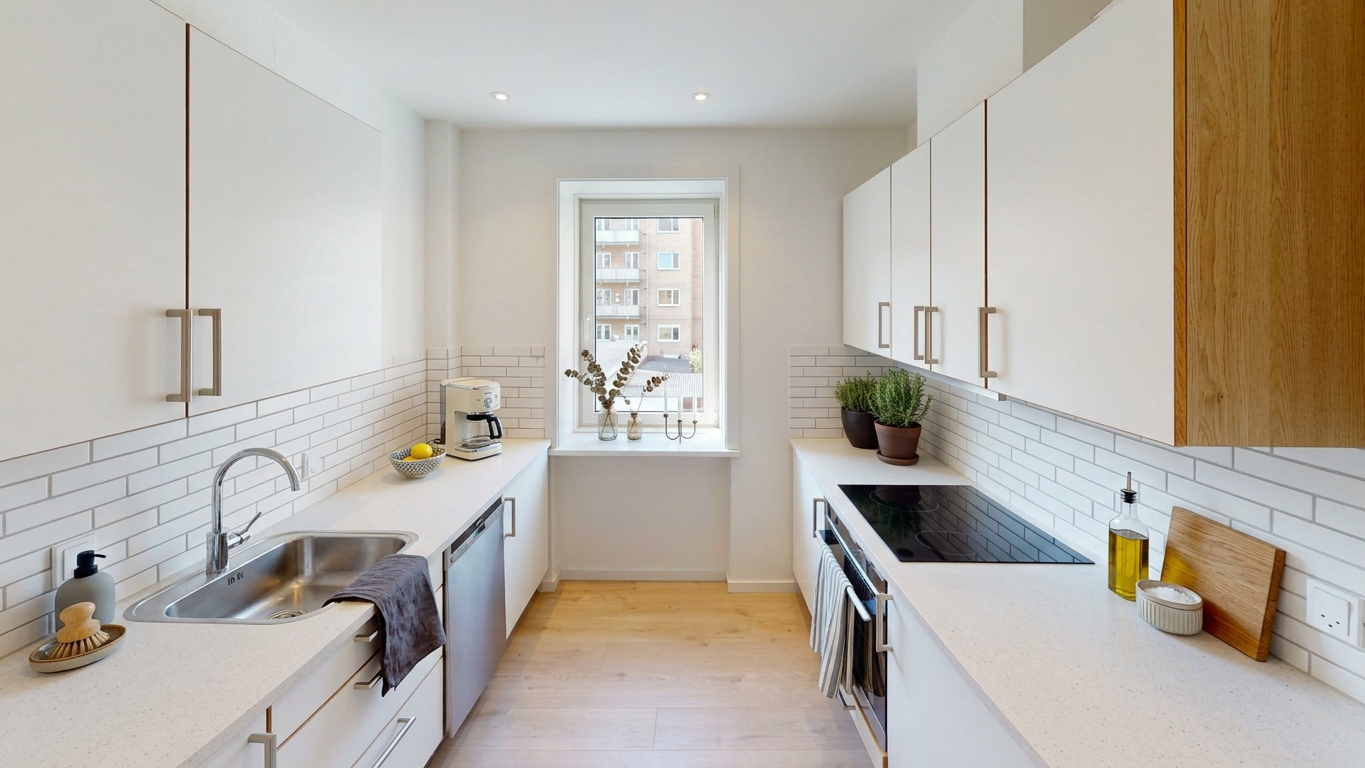 Et pænt og funktionelt køkken med komfur, køle-/fryseskab og opvaskemaskine