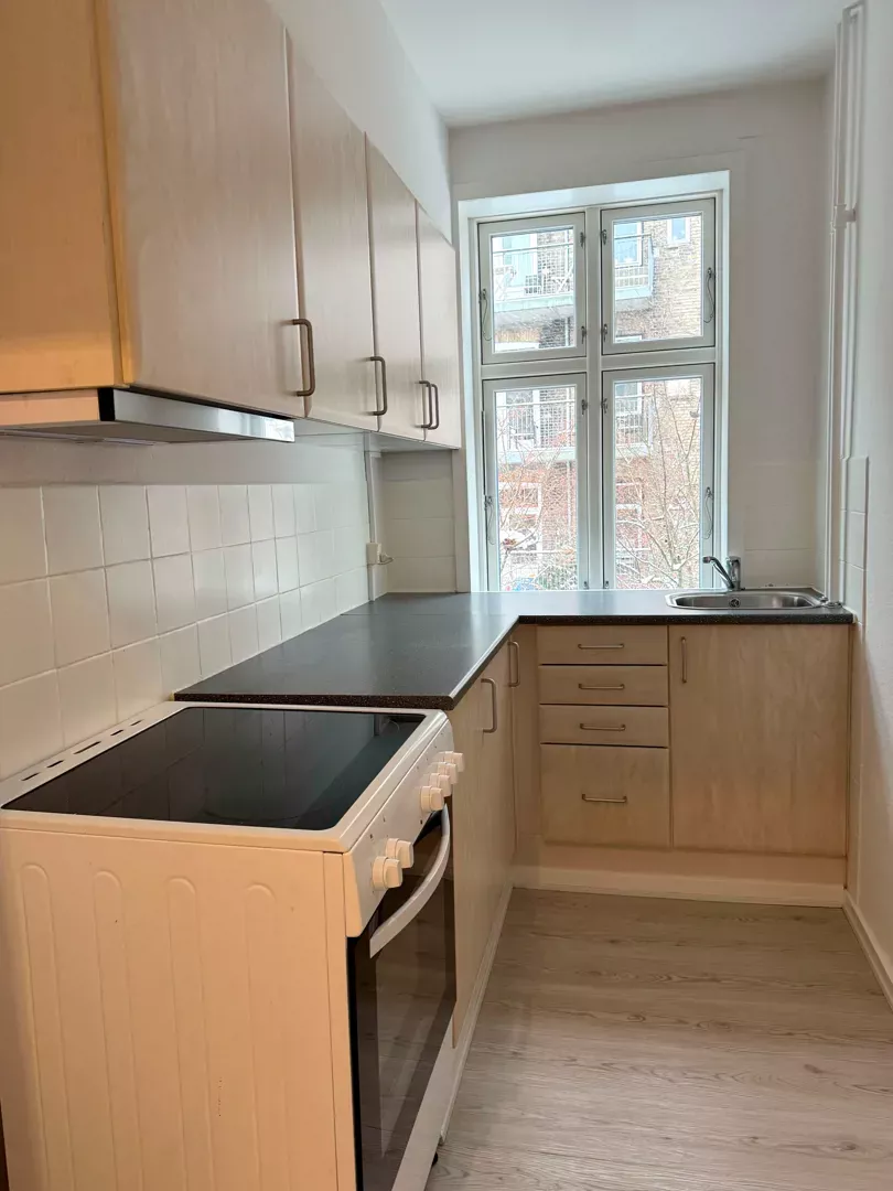 Køkkenet er helt nyt i hvide, grebsfrie elementer med god bord- og skabsplads, indbygningsspots og alle de nødvendige hvidevarer: opvaskemaskine, induktionskogeplade, indbygningsovn, emhætte samt køle/frys. Et stort vindue giver et behageligt lysindfald og kig mod gården.