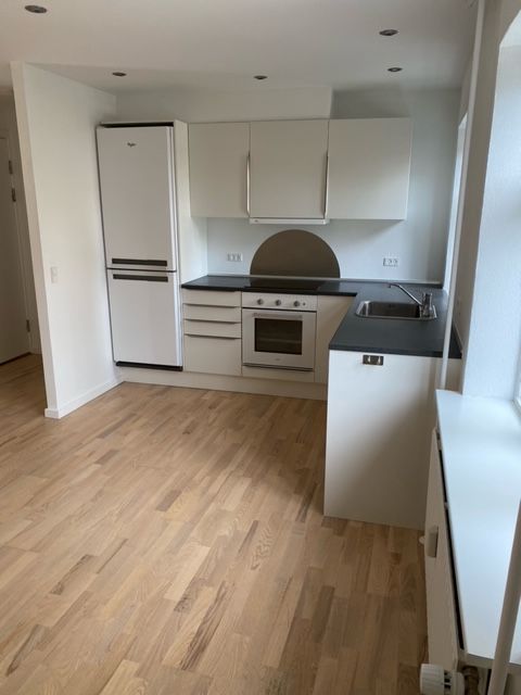 Lys 2-værelses med plankegulve, separat køkken og parkering