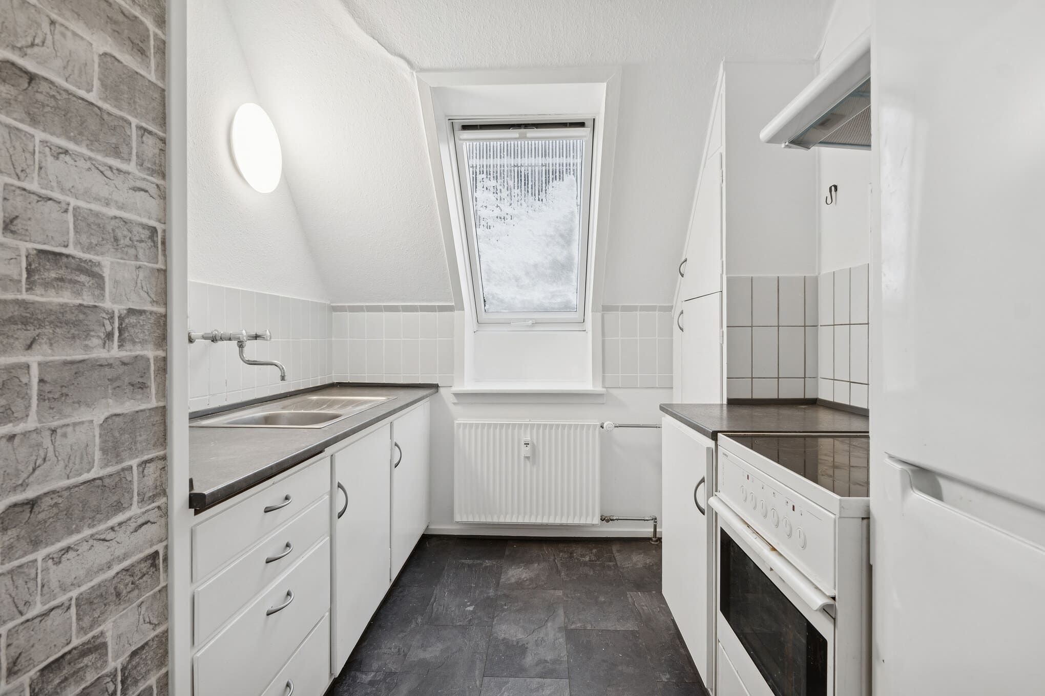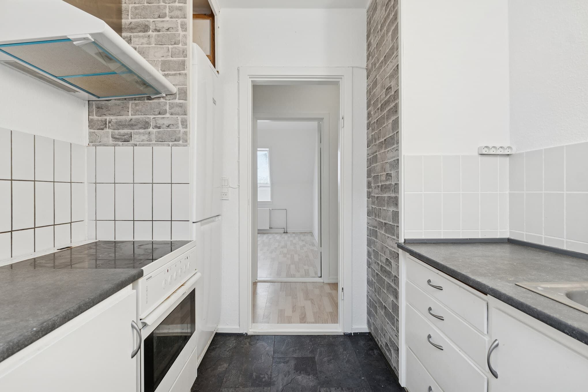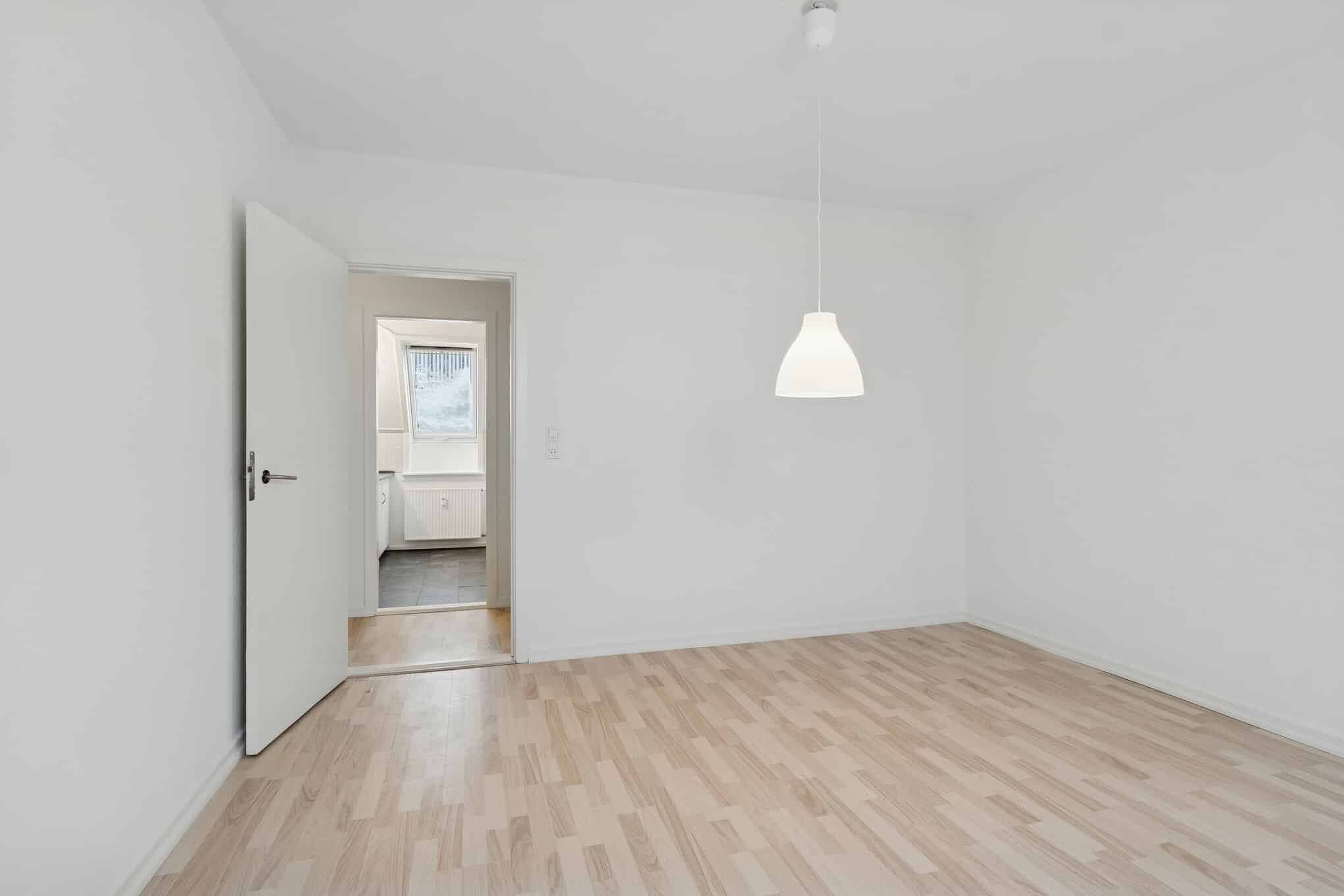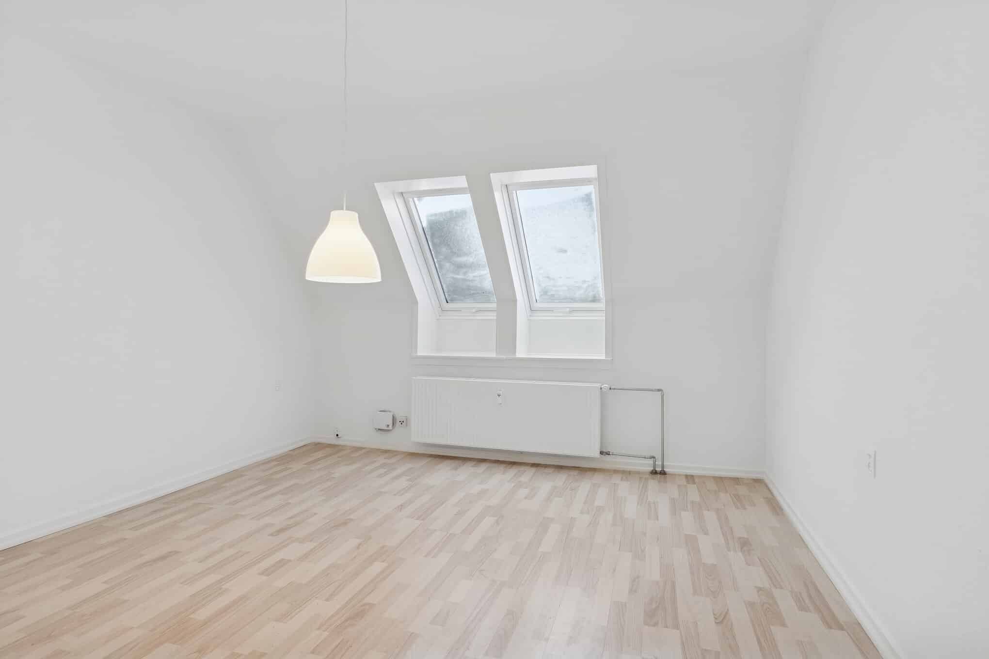 De to værelser giver dig fleksibilitet, uanset om du ønsker soveværelse og kontor eller en delevenlig løsning. Køkkenet er enkelt og praktisk med hvide elementer, komfur og køle-/fryseskab, og badeværelset har vindue, så der altid er naturligt lys og mulighed for udluftning.
