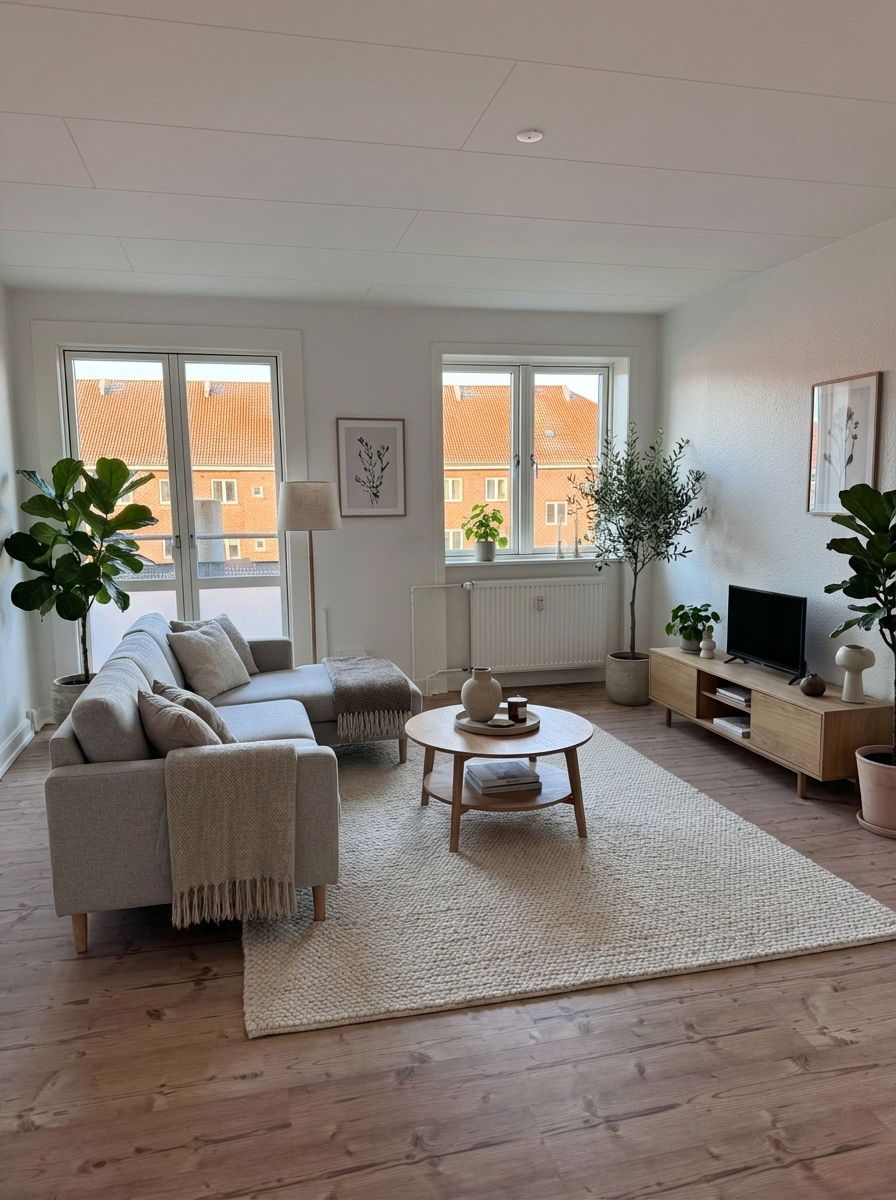 Lejligheden indeholder en fordelingsgang, to lyse stuer en suite, et stort