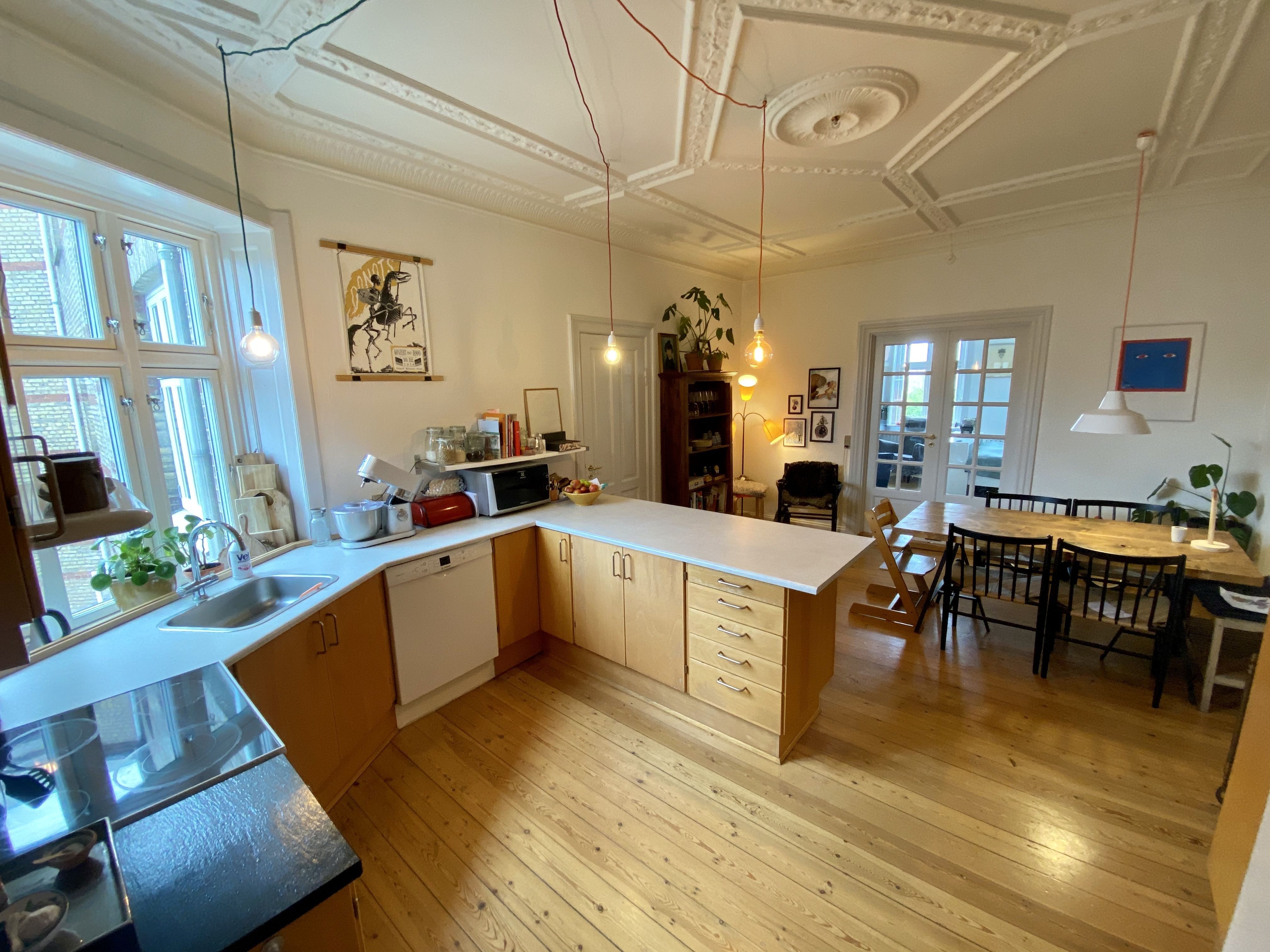 Skøn lejlighed i 2 etager udlejes i smuk ejendom. Vi er i gang med renoveringen så flere fotos kommer når vi er færdige. Indretning. Lille entre med plads til lille kommode og skab til jakker og sko. Stue 1. Hyggelig forstue med flot lud behandlet planke gulv, 2 vinduer ud mod gaden. Spisestue/køkkenalrum flot nyt hth køkken med opvaskemaskine, ovn, kogeplade induktion og kølefryseskab. Planke gulve. Soveværelse med adgang til nyrenoveret badeværelse, gulvvarme og lækker stor bruseniche. Øverst etage. Trappe op til stor lys opholdsstue med lille altan ud til gaden, Velux vinduer ud til gaden og gården med udsigt til Aarhus Ø. Toilet med håndvask og vaske søjle vaskemaskine og tørretumbler. Planke gulve. Ende væg med reol. Flot lys lejlighed med charme, højt til loftet, planke gulve som er lud behandlet, ny malet, nyt køkken nyt badeværelse med gulvvarme. Smuk ejendom centralt beliggende i Aarhus C