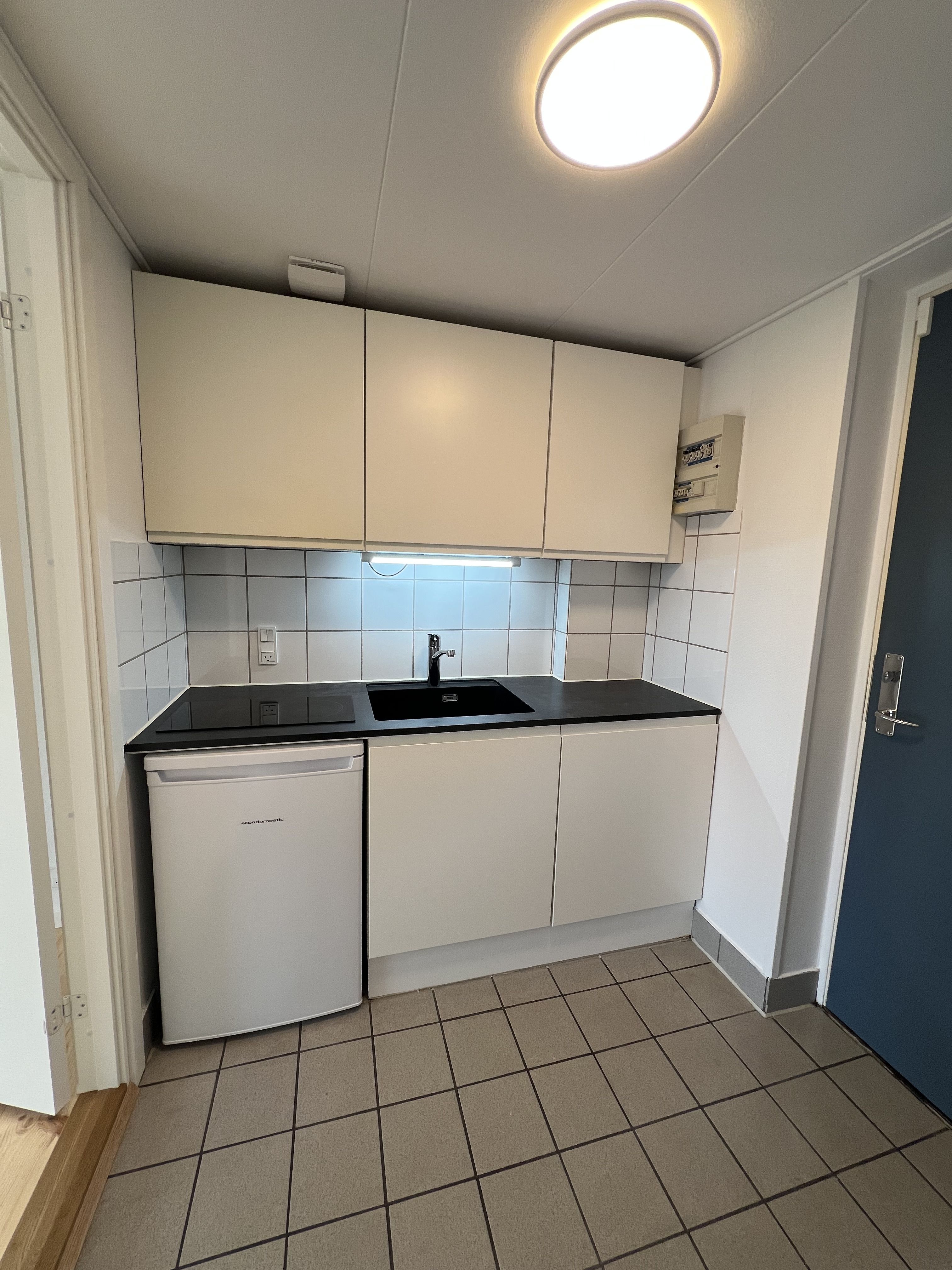 *Trinettekøkken med 2 kogeplader, køleskab og stor håndvask