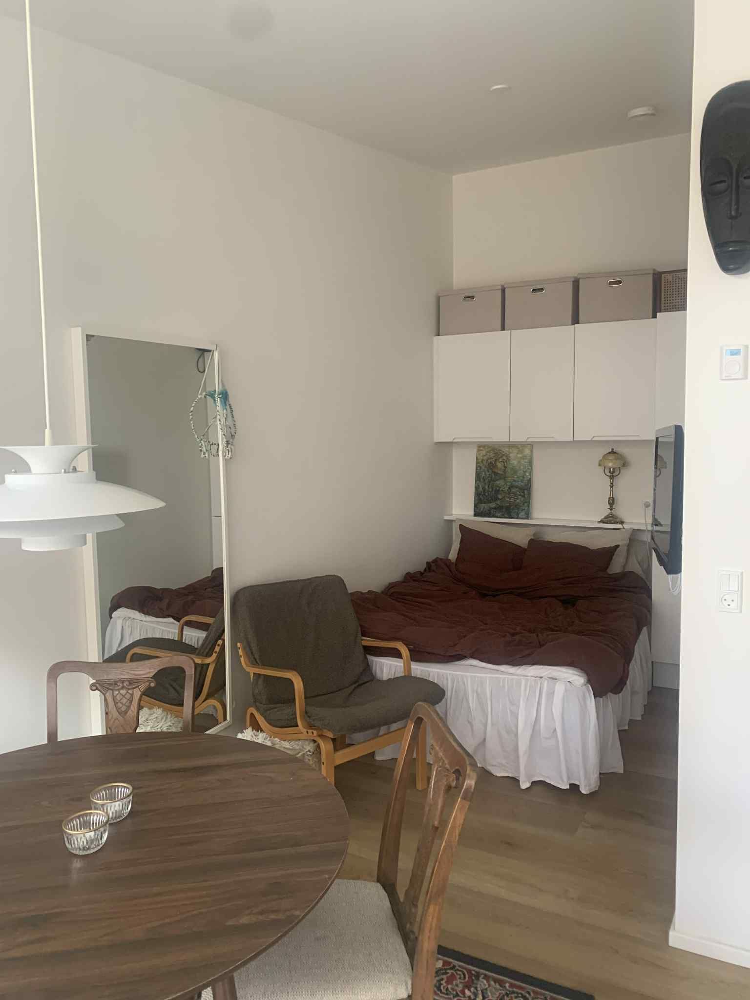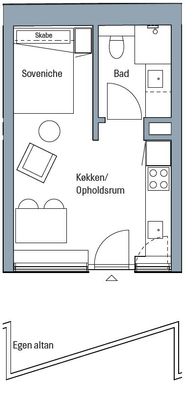 - Hyggelig hems med soveplads (140x200 cm) og indbygget klædeskab (ca. 3. m2)