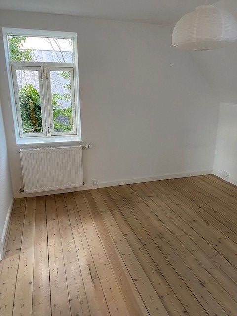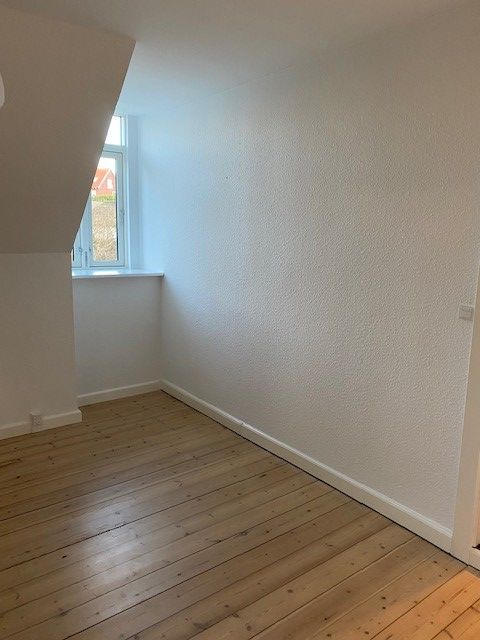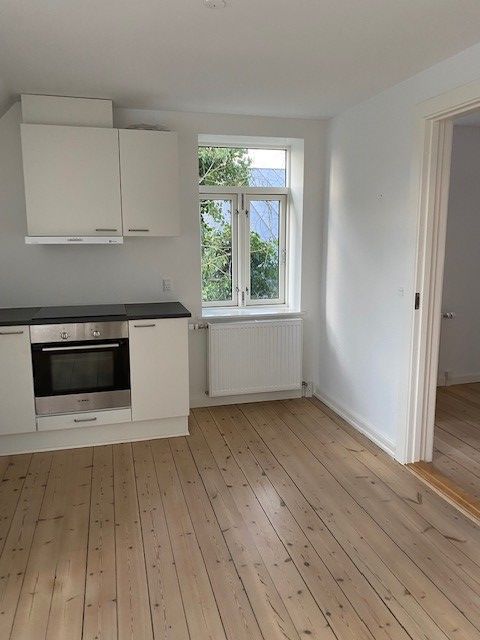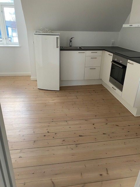 Køkken er lavet som et åbent køkken, men virker smart integreret i lejligheden. Badeværelset er opmuret, vandskuret og med hvide klinker på gulv. Der er lille trappe til sovehems, så der næsten er et lille soveværelse. Parketgulv, skæve vinkler, buede kviste, synligt fuldtømmer - lys og udsigt til Mols over byens tage.