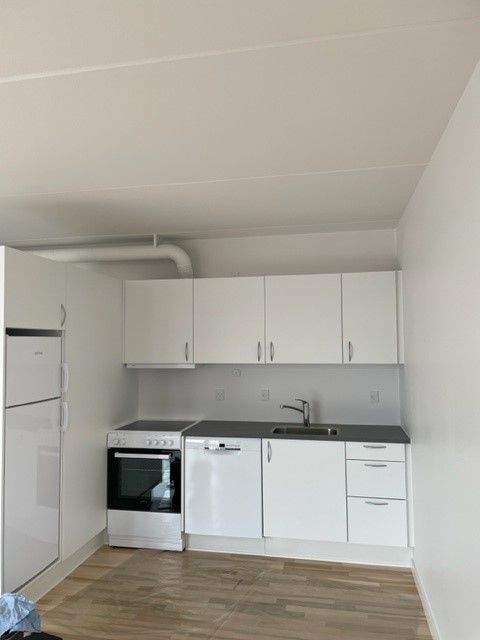 Der medfølger hårde hvidevarer i form af ovn, kogeplade og køleskab med integreret fryser.
