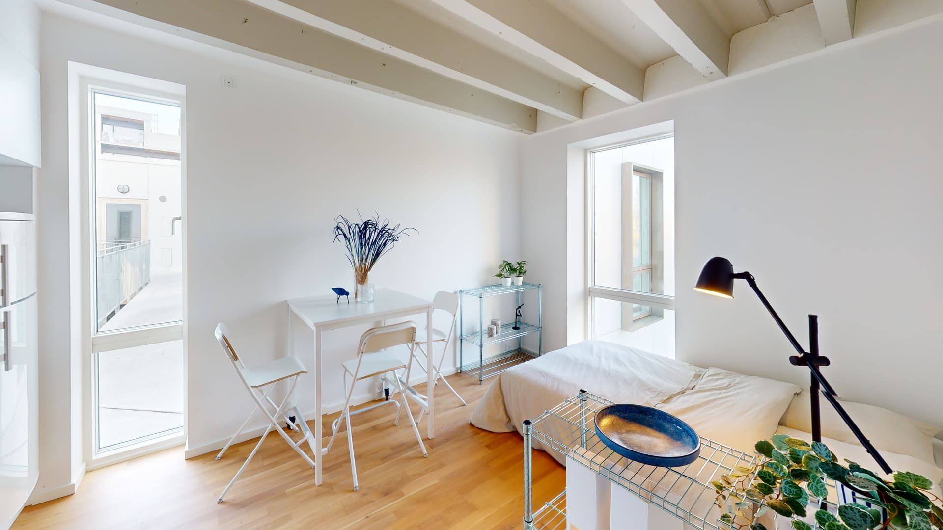Flot lejlighed på 42 kvm. med højt til loftet og køkken/alrum, en flot udsigt over byen fra en fin altan, grønne områder og Brabrand Sø.