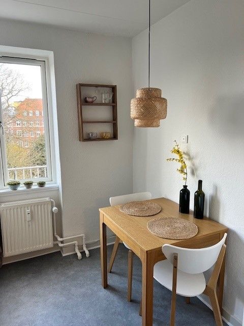 Lejligheden er på 2. etage og består af 2 værelser (1 stue/køkken/alrum og 1 soveværelse) samt en privat altan. Der er vaskemaskine, tørretumbler, opvaskemaskine og køleskab. Derudover findes der et kælderrum samt cykelparkering. Lejlighed er for ikke-rygere og husdyr er ikke tilladt. Overtagelse d. 1 august 2026. Lejeperiode er begrænset til 3 år. Forbrug betales særskilt af lejer. Lejligheden ligger fantastisk placeret for byliv, hverdag, nærvær og natur. Fremvisning om søndagen mellem kl. 17 og 18 efter forhåndsaftale.