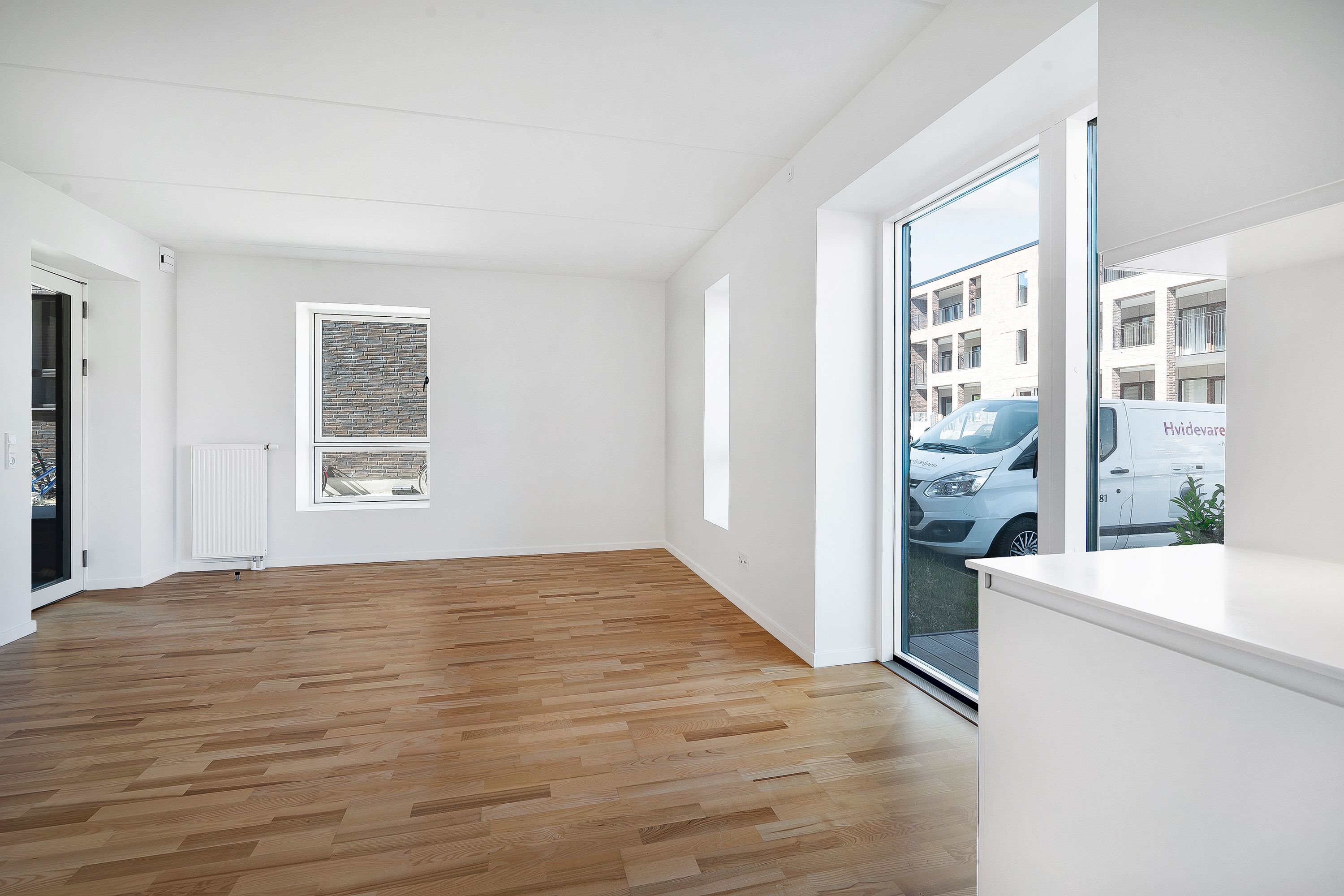 From the entrance on 1. floor stairs lead up to the living room and kitchen in an open concept design. The apartment has beautiful vaulted ceilings and 2 small balconies, one placed by the living room facing the street, the other placed by the kitchen facing the backyard.