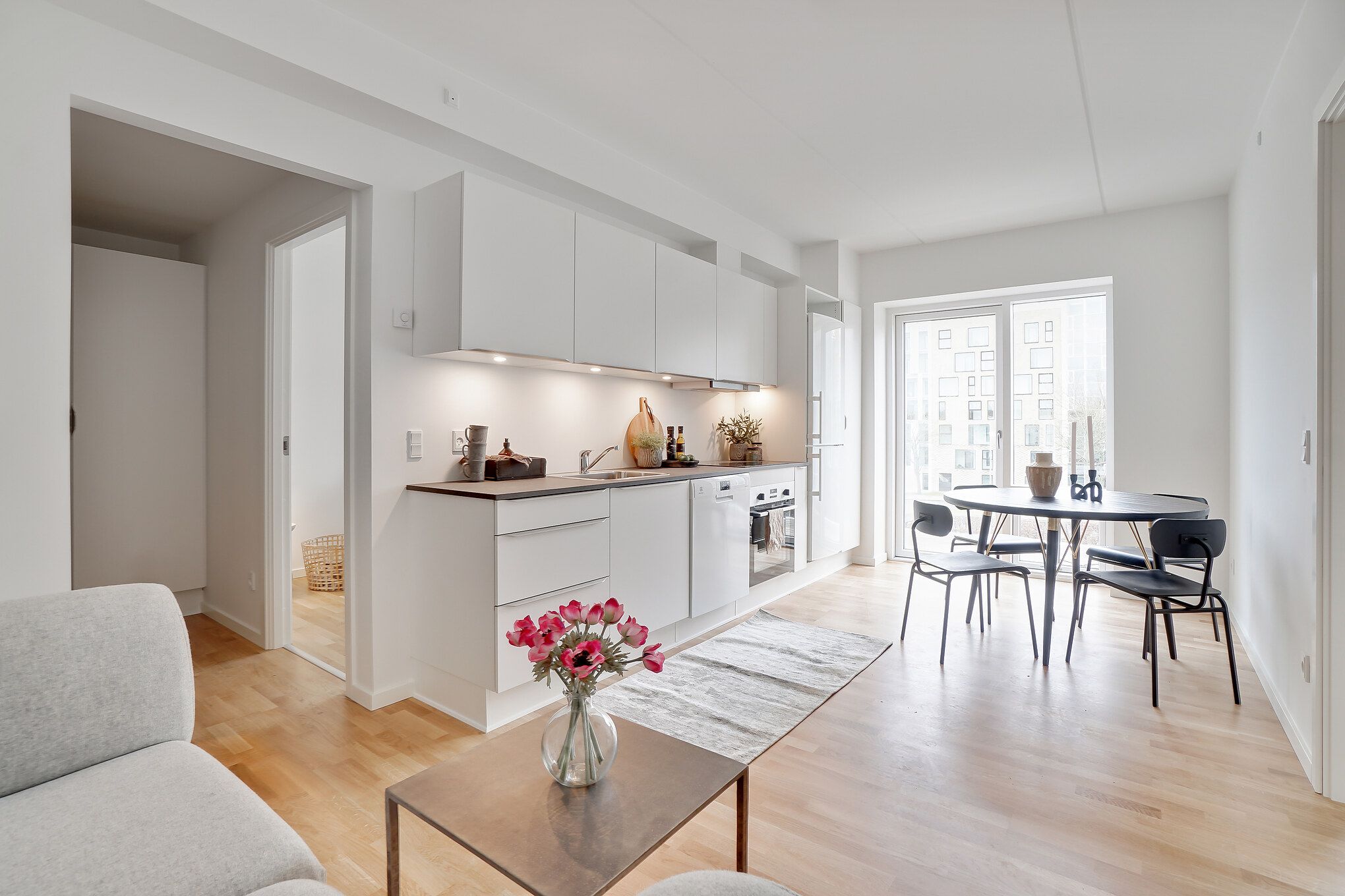I denne lejlighed finder du lækre materialevalg i stilrent design. I får et lyst badeværelse, hvor der er klargjort til tilslutning af vaskemaskine. Lejligheden er optimalt indrettet samt med gulvvarme i hele boligen. Boligen fremstår lys og indbydende grundet de store vinduespartier. Der er adgang til en stor terrasse fra lejemålet.