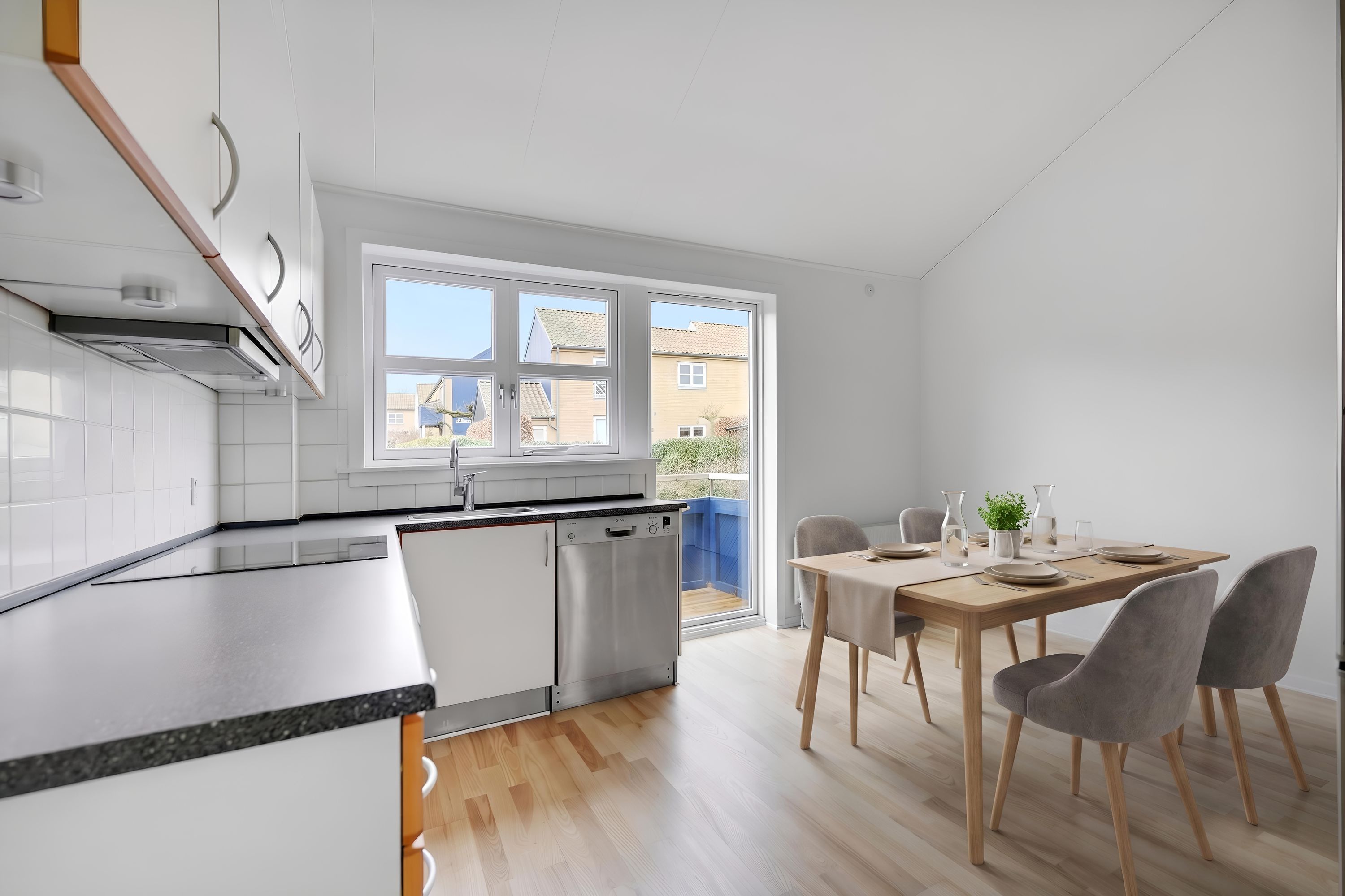 Køkken med emhætte, indb. ovn, keramisk kogeplade, stort køl/fryse skab og opvaskemaskine.