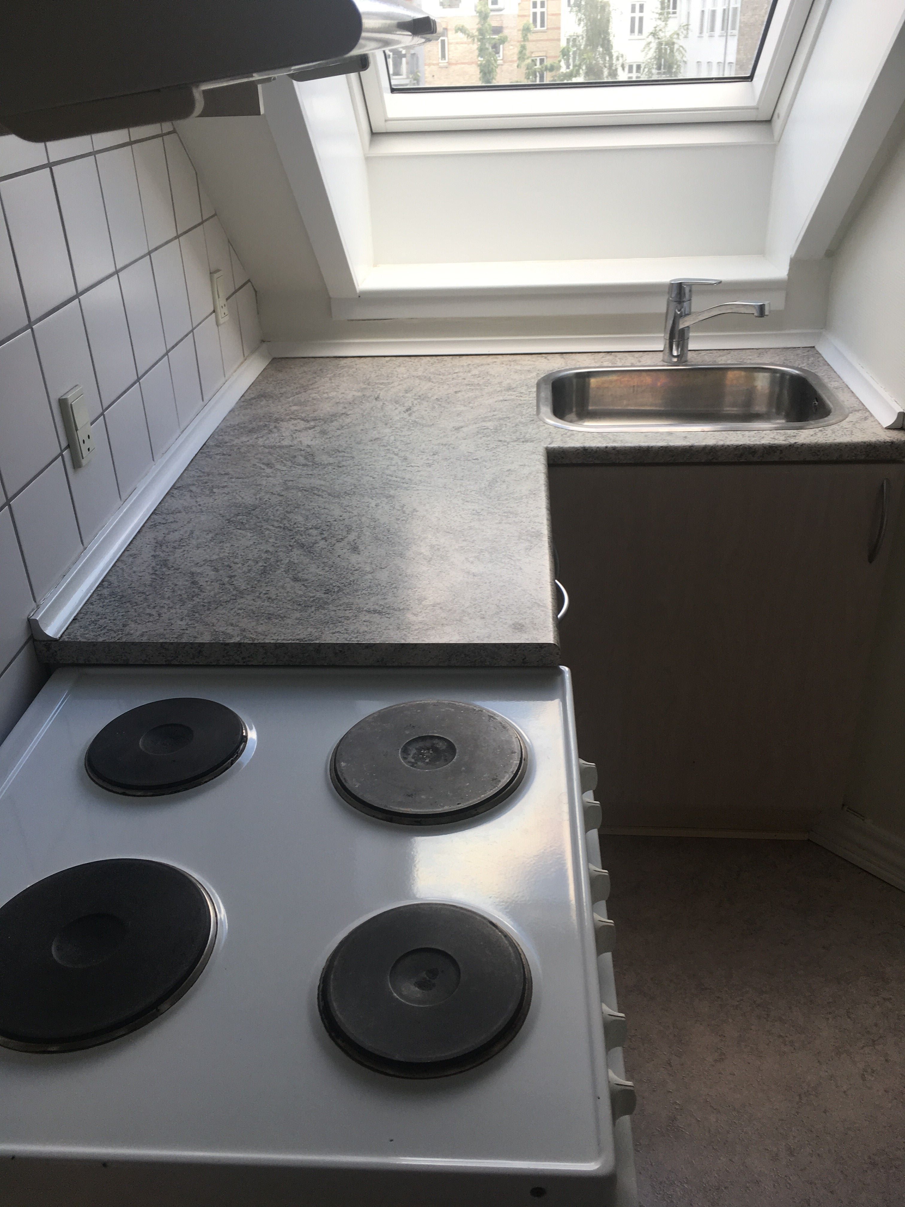 : er fuldt udstyret med alle hårde hvidevarer, herunder opvaskemaskine, ovn og komfur. Her får du et dejligt lysindfald fra det store vinduesparti over vasken med udsigt til grønne arealer.