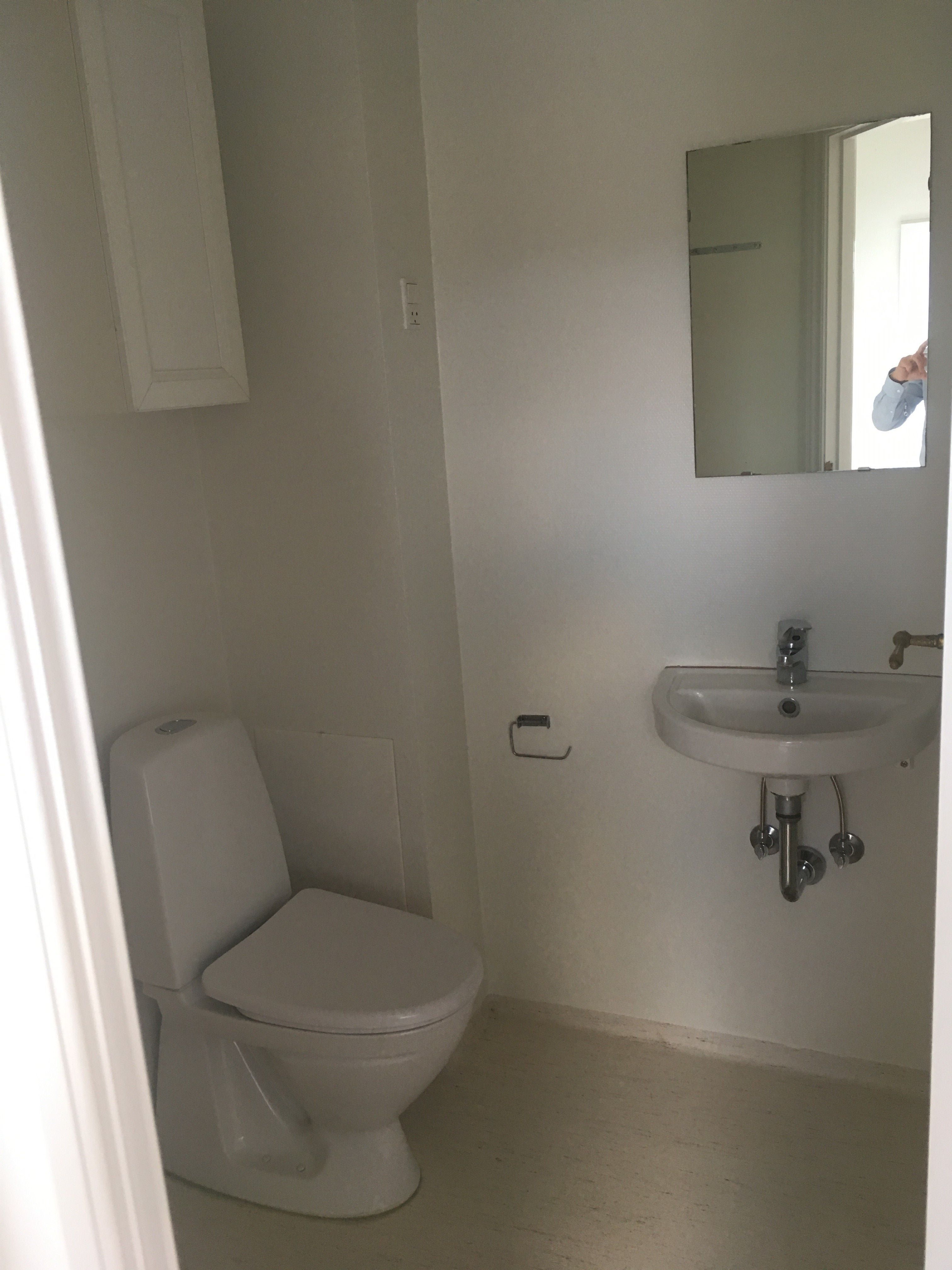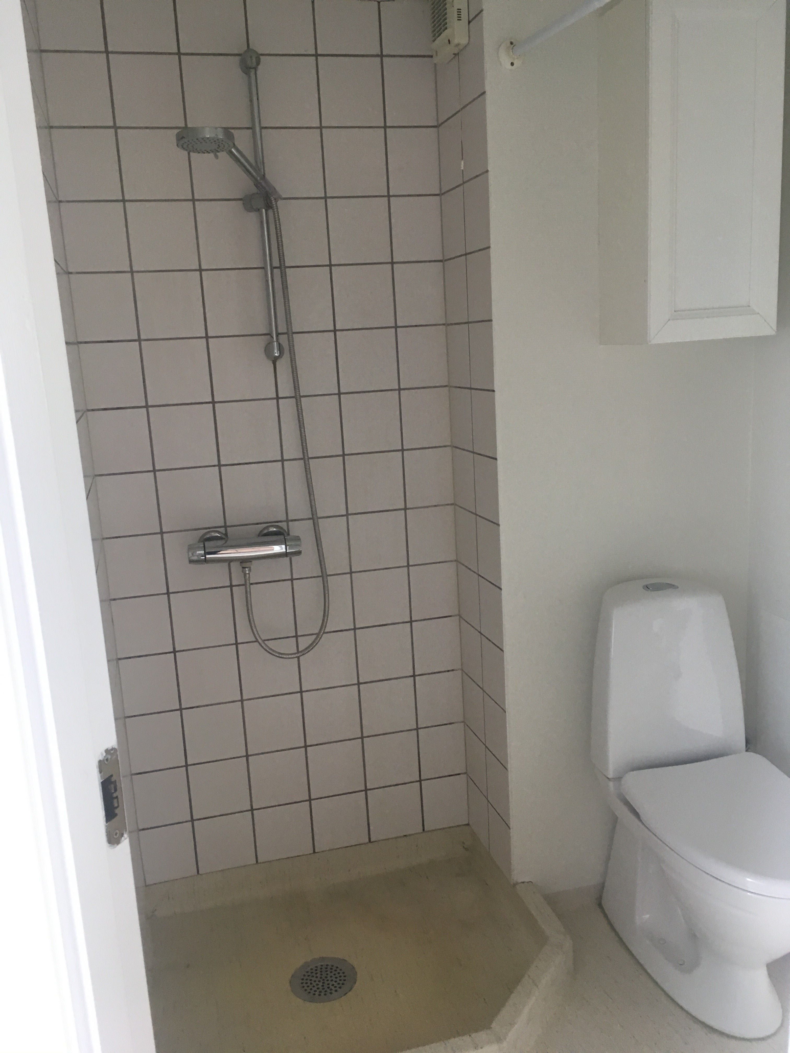 : fremstår lyst og moderne med flotte klinker, separat bruseniche samt vaskesøjle.
