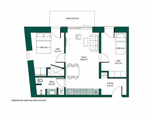 : er rummelig med plads til både sofa og spisebord – ideelt til hyggelige aftener og samvær med familie og venner.