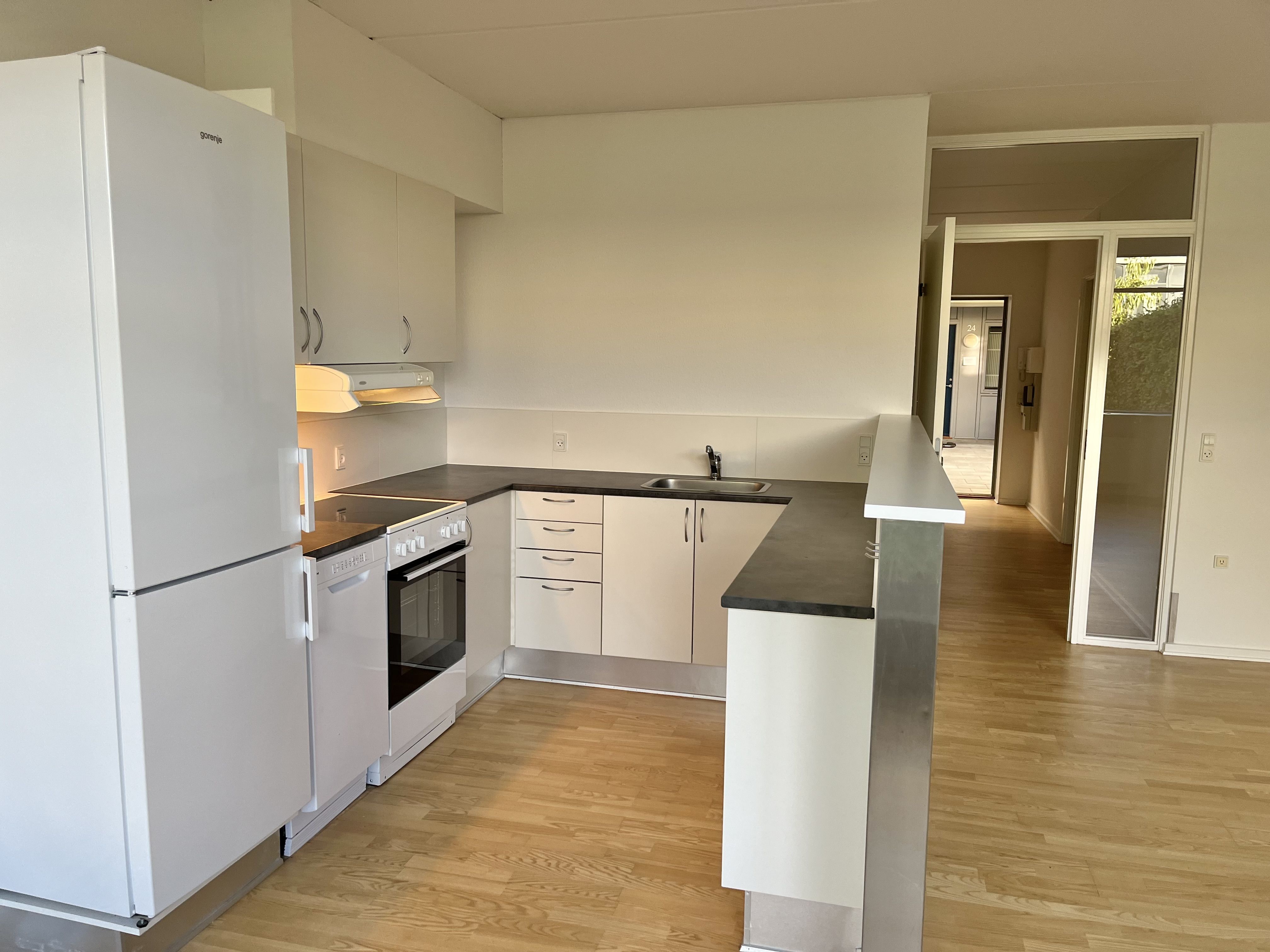 Denne skønne lejlighed byder på en moderne indretning og masser af lys – perfekt til dig, der ønsker både komfort og funktionalitet. : er fuldt udstyret med alle hårde hvidevarer, herunder opvaskemaskine, ovn og komfur. Her får du et dejligt lysindfald fra det store vinduesparti over vasken med udsigt til grønne arealer. : er rummelig med plads til både sofa og spisebord – ideelt til hyggelige aftener og samvær med familie og venner. med indbyggede skabe, der giver masser af opbevaringsplads. : fremstår lyst og moderne med flotte klinker, separat bruseniche samt vaskesøjle. Derudover får du adgang til fælles grønne arealer, som indbyder til afslapning og udeliv. Der kan søges om at holde et stk. mindre husdyr.
