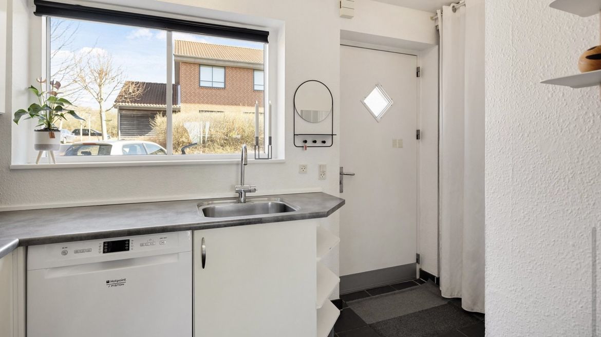 Køkkenet er et flot matlakeret hvidt luksuskøkken produceret med masser af skabsplads. Her er bl.a hvide over- og underskabe, indbyggede spots, integreret opvaskemaskine, integreret køle-fryseskab, varmluftovn, keramiske kogeplader og integreret emhætte med aftræk.