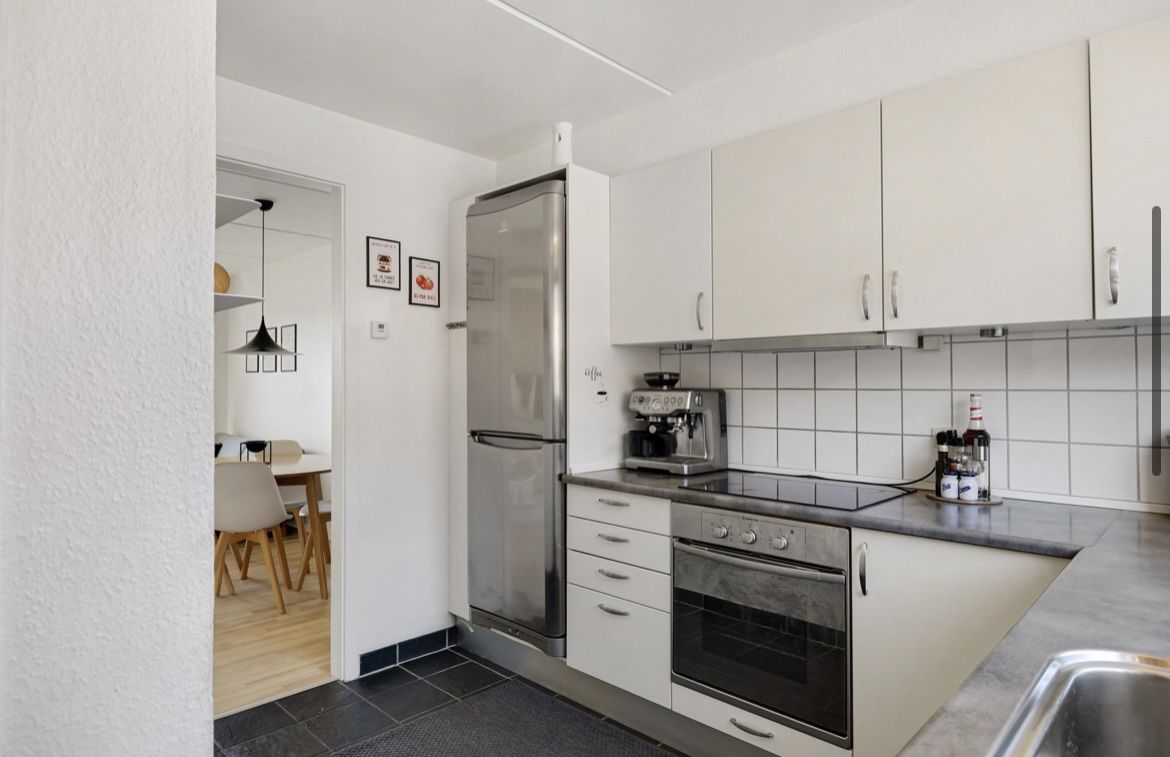 Lejligheden byder på elevator til døren (fra hovedindgang og p-kælder), en rummelig entré med dørtelefon og god plads til sko og overtøj. Fra entréen har du adgang til det lyse køkken/alrum, hvor der ikke er sparet på noget.
