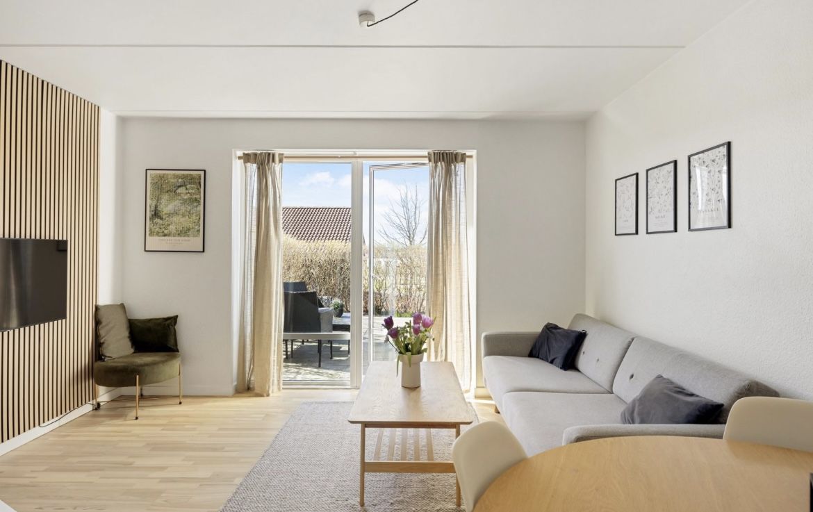 Fra stue/køkkenalrum er der adgang til to store lyse værelser med plads til både seng og ekstra skabe, foruden de to store skabe, som er i lejligheden, når du flytter ind. Stue og værelser har flotte matlakerede egetræsgulve i nordisk eg. Der er højt til loftet, gulvvarme i alle rum, som du styrer digitalt, ligesom lejligheden har et moderne Genvexanlæg, der sikrer et rigtig godt indeklima året rundt.