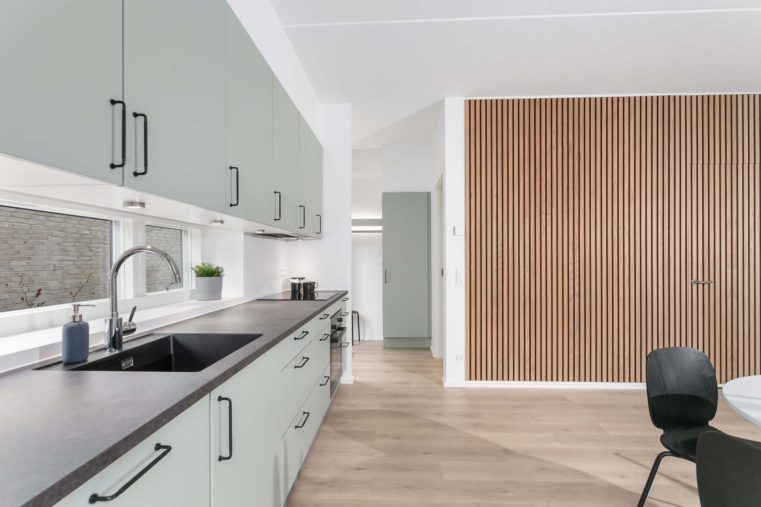 egeparket giver rummene en naturlig atmosfære, mens vinduespartierne sikrer