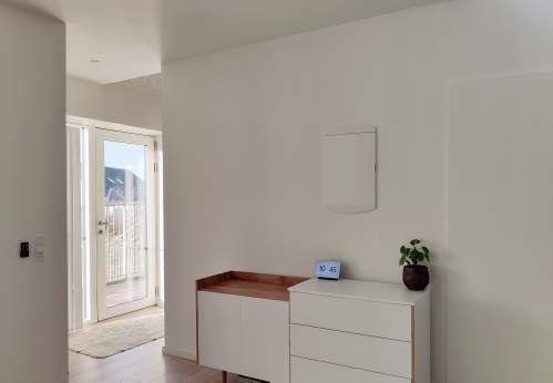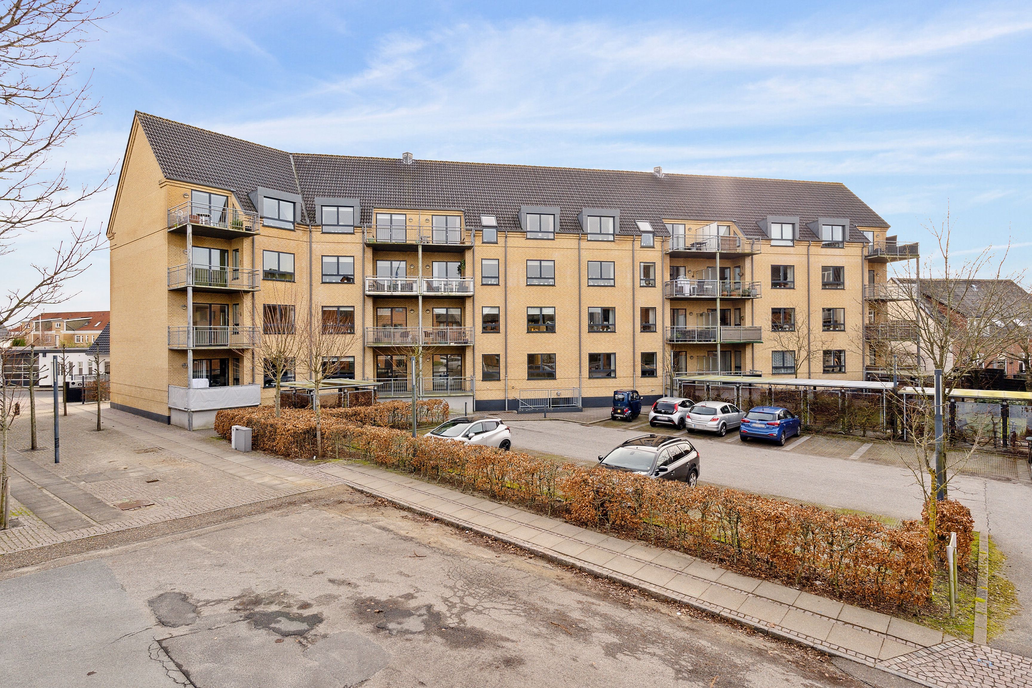 Lys og moderne lejlighed bestående af entre med mange indbyggede skabe, teknik/baggang med plads til vaskemaskine/ tørretumbler. Køkken/alrum, soveværelse ligeledes med mange indbyggede skabe og adgang til badeværelse. Værelse med indbyggede skabe, lille gang og gæste toilet. På begge sider af lejligheden er der store altaner, på den ene altan er der et depotrum. Der er gulvvarme og ventilation. Til lejligheden hører privat carport.