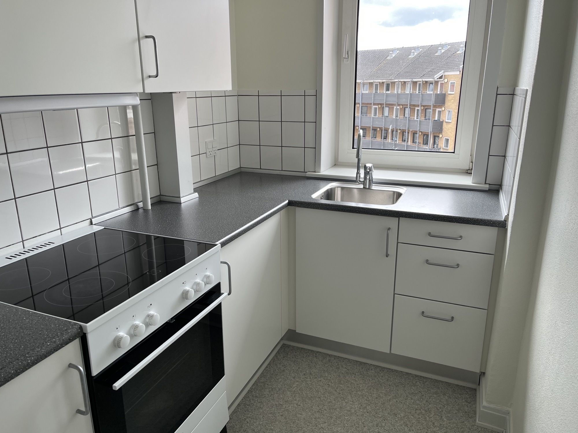 Lyst og åbent køkken alrum med alt i hårde hvidevare
