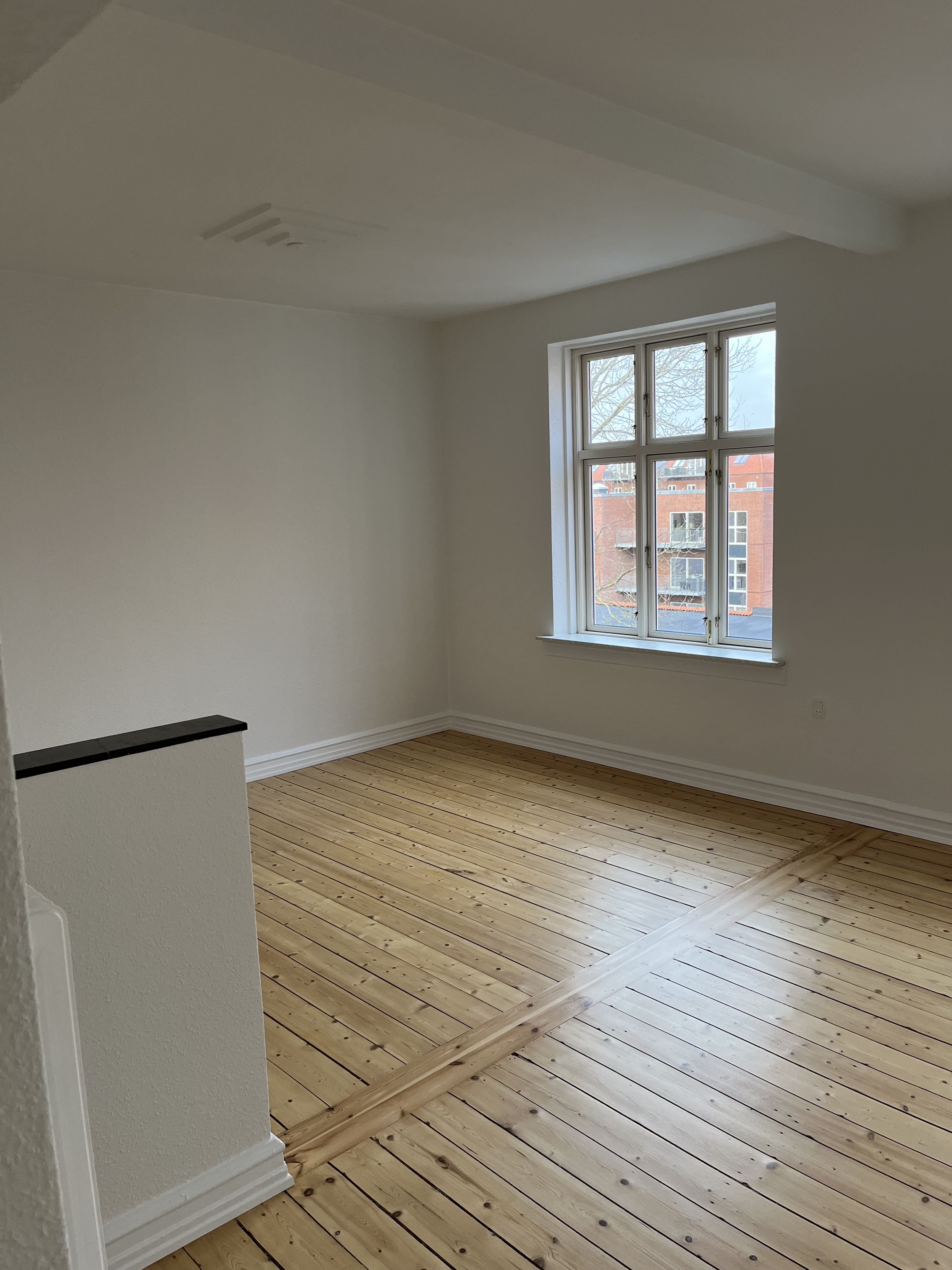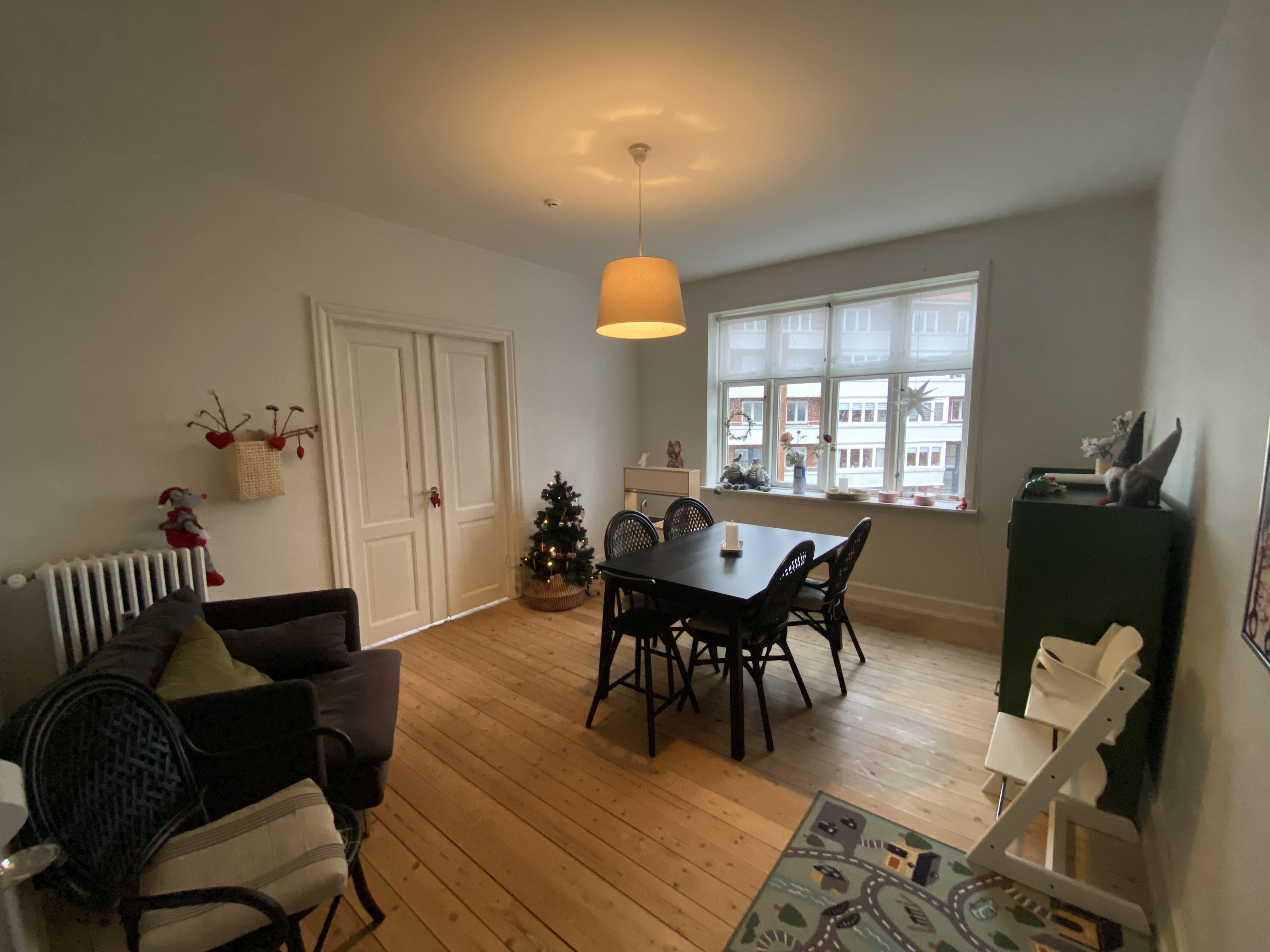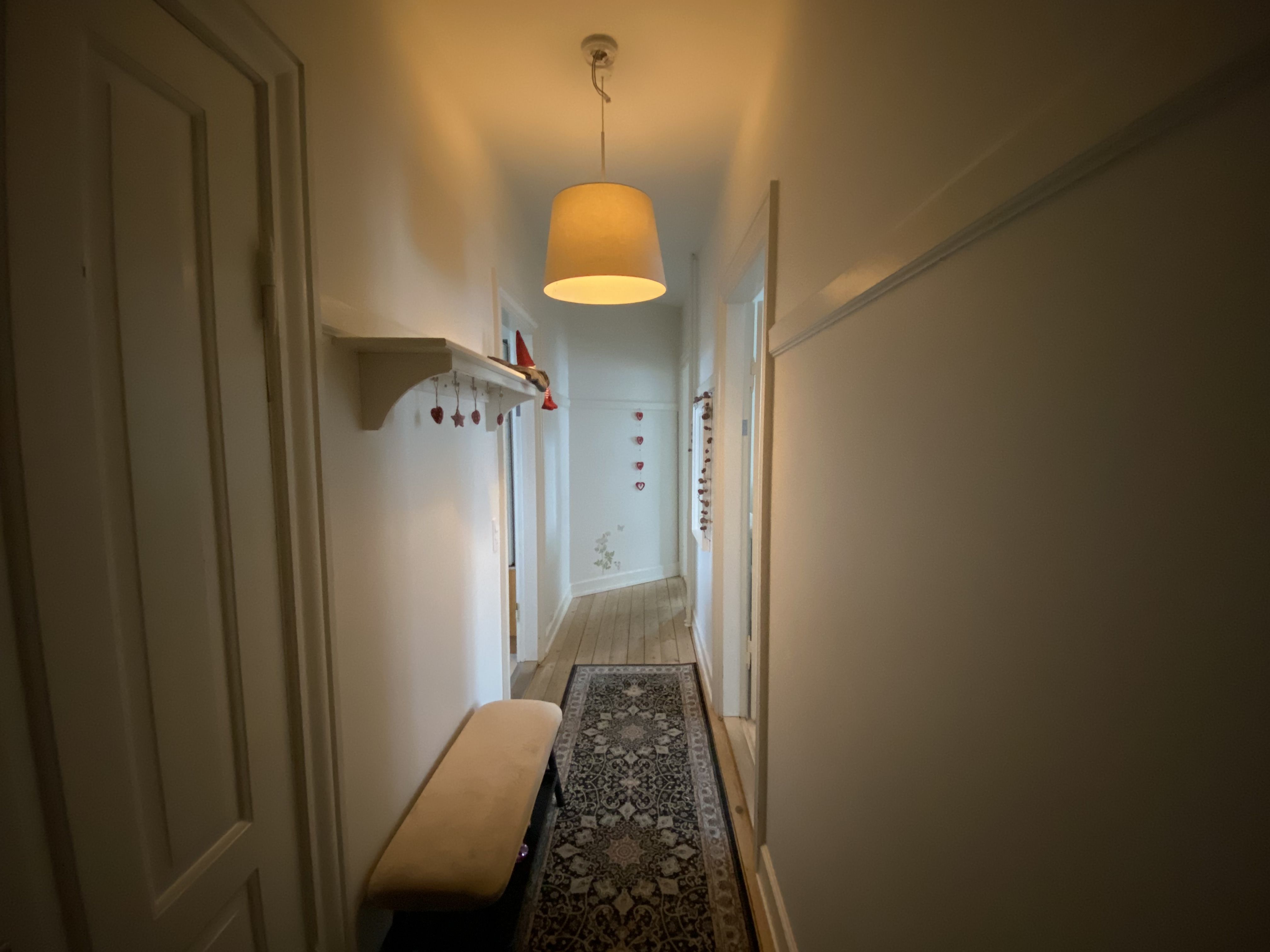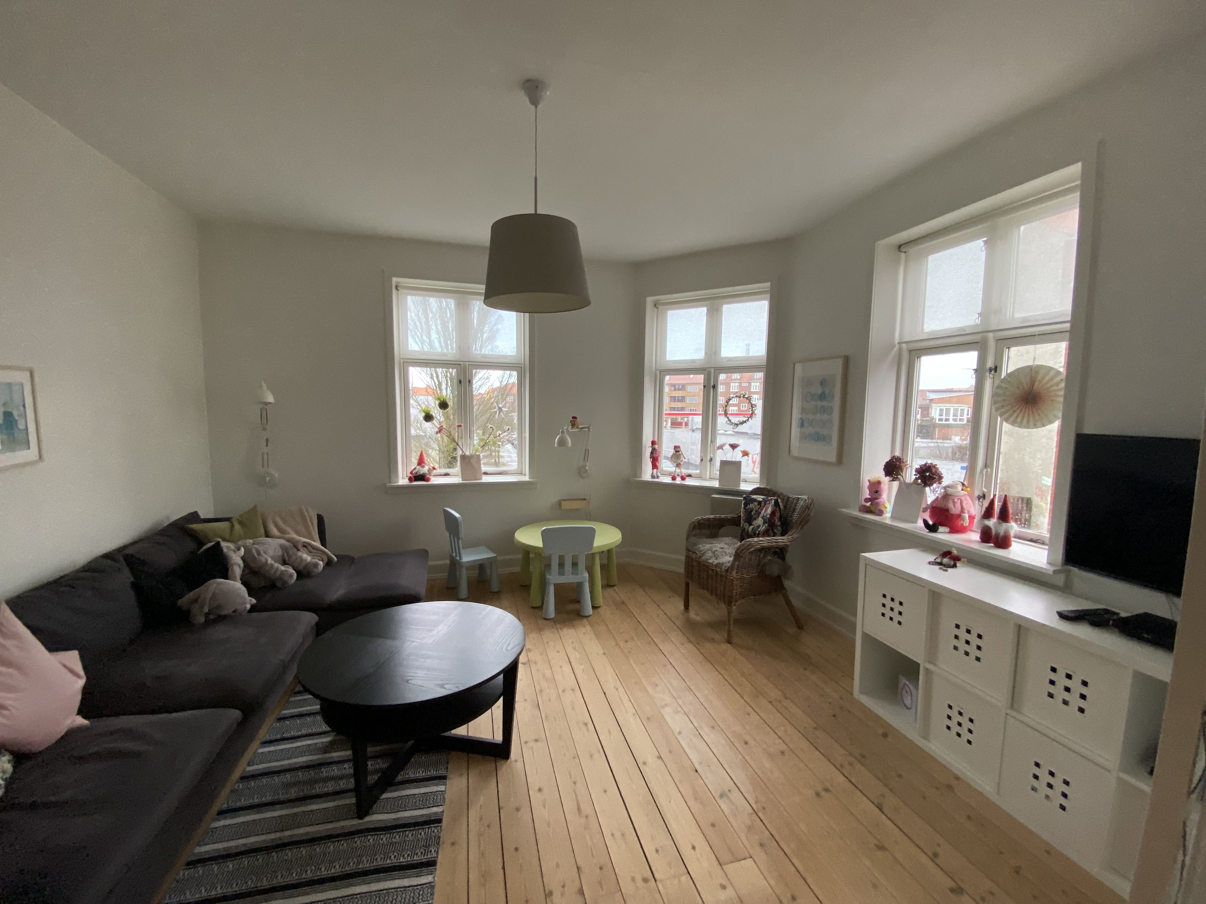 Lejligheden er lys og hyggelig med plankegulve i sæbebehandlet fyr.