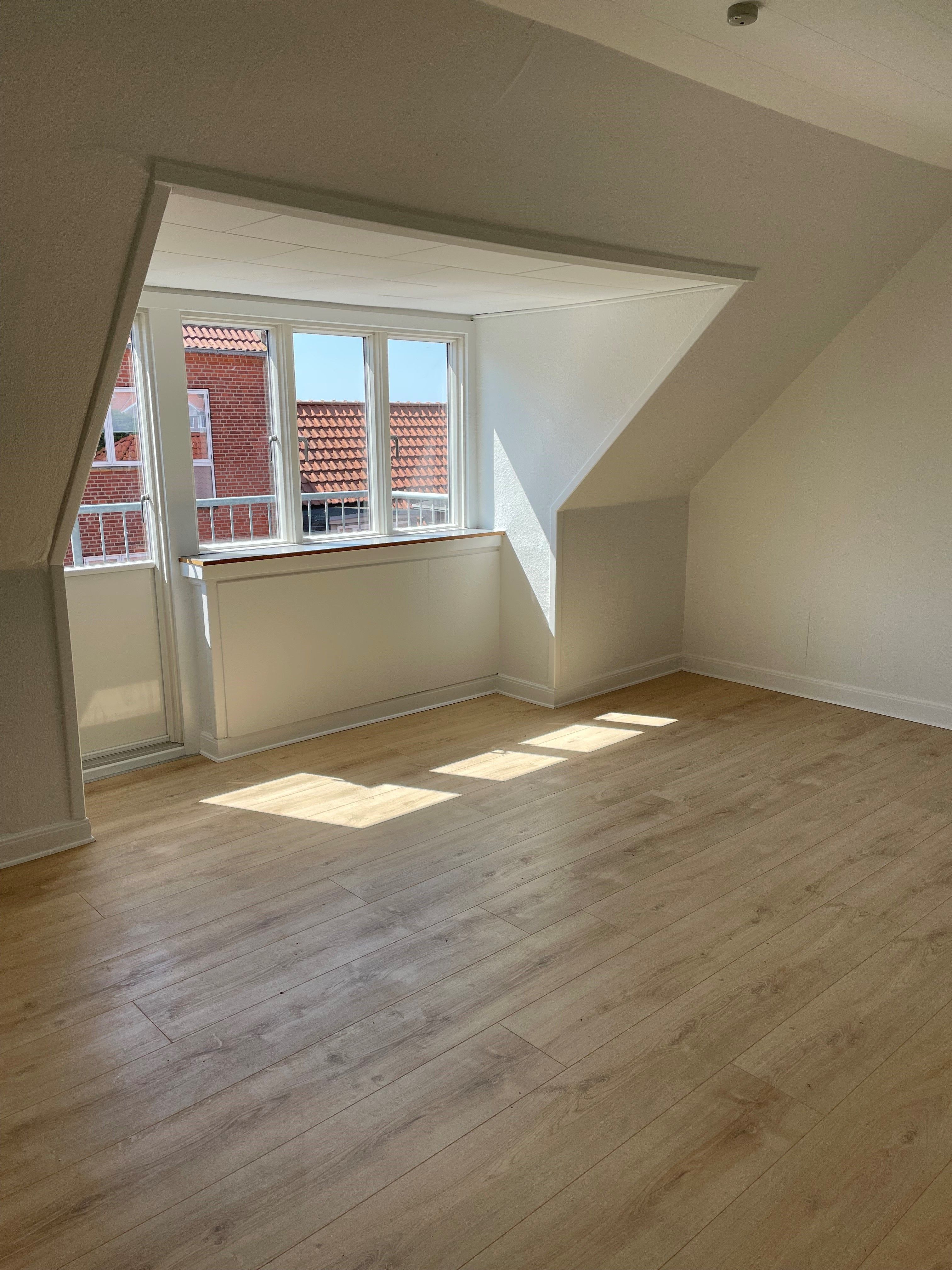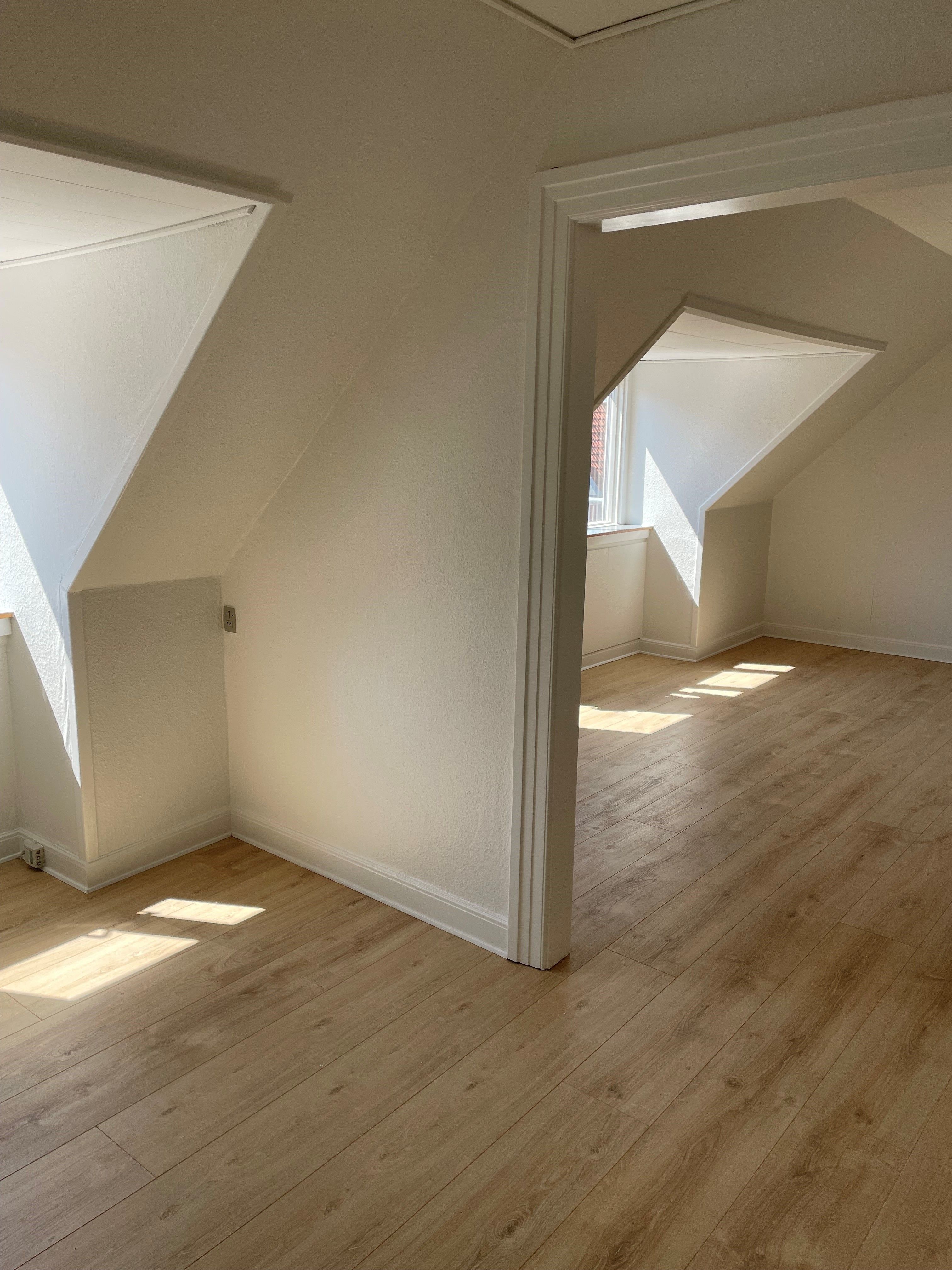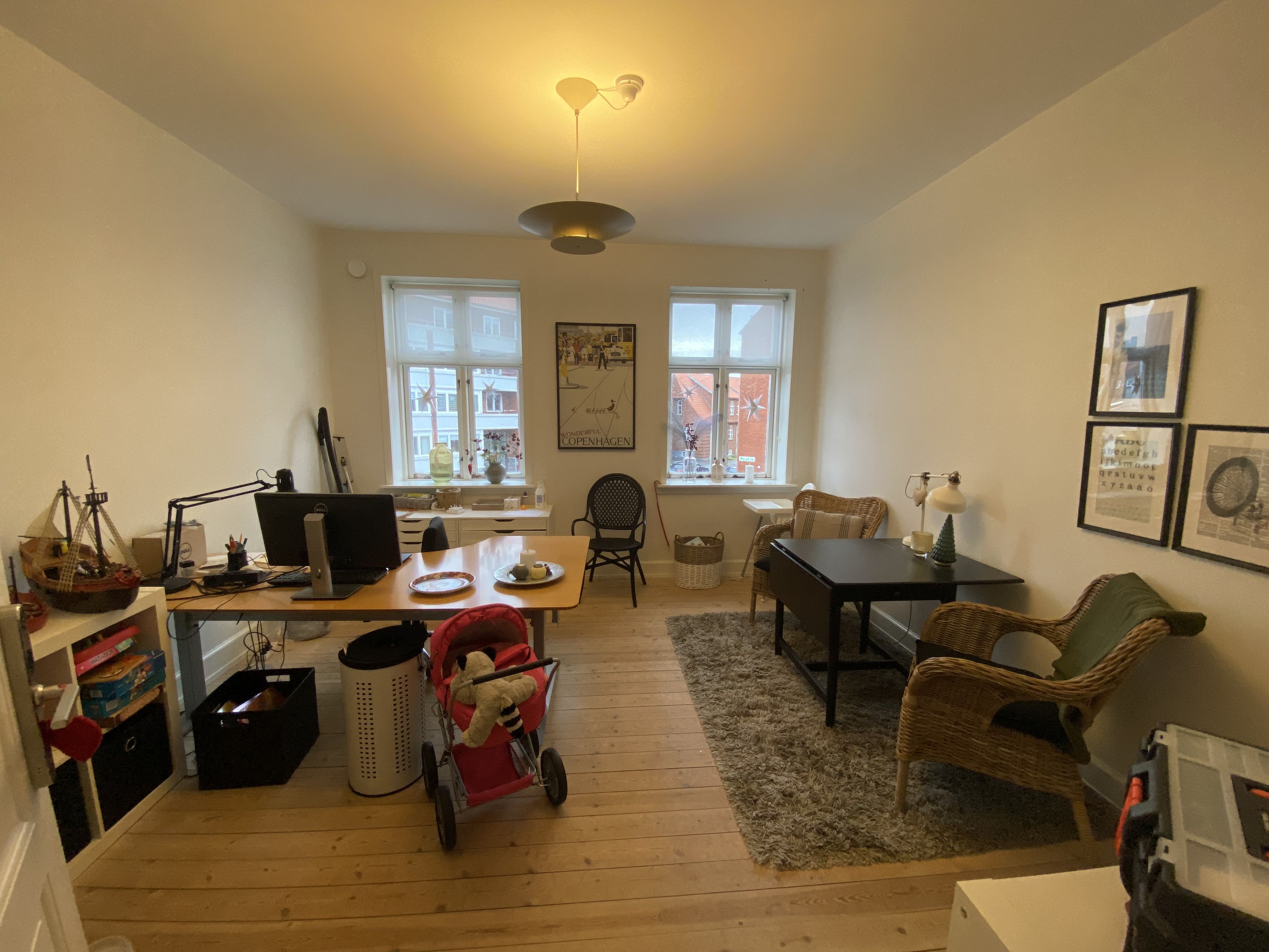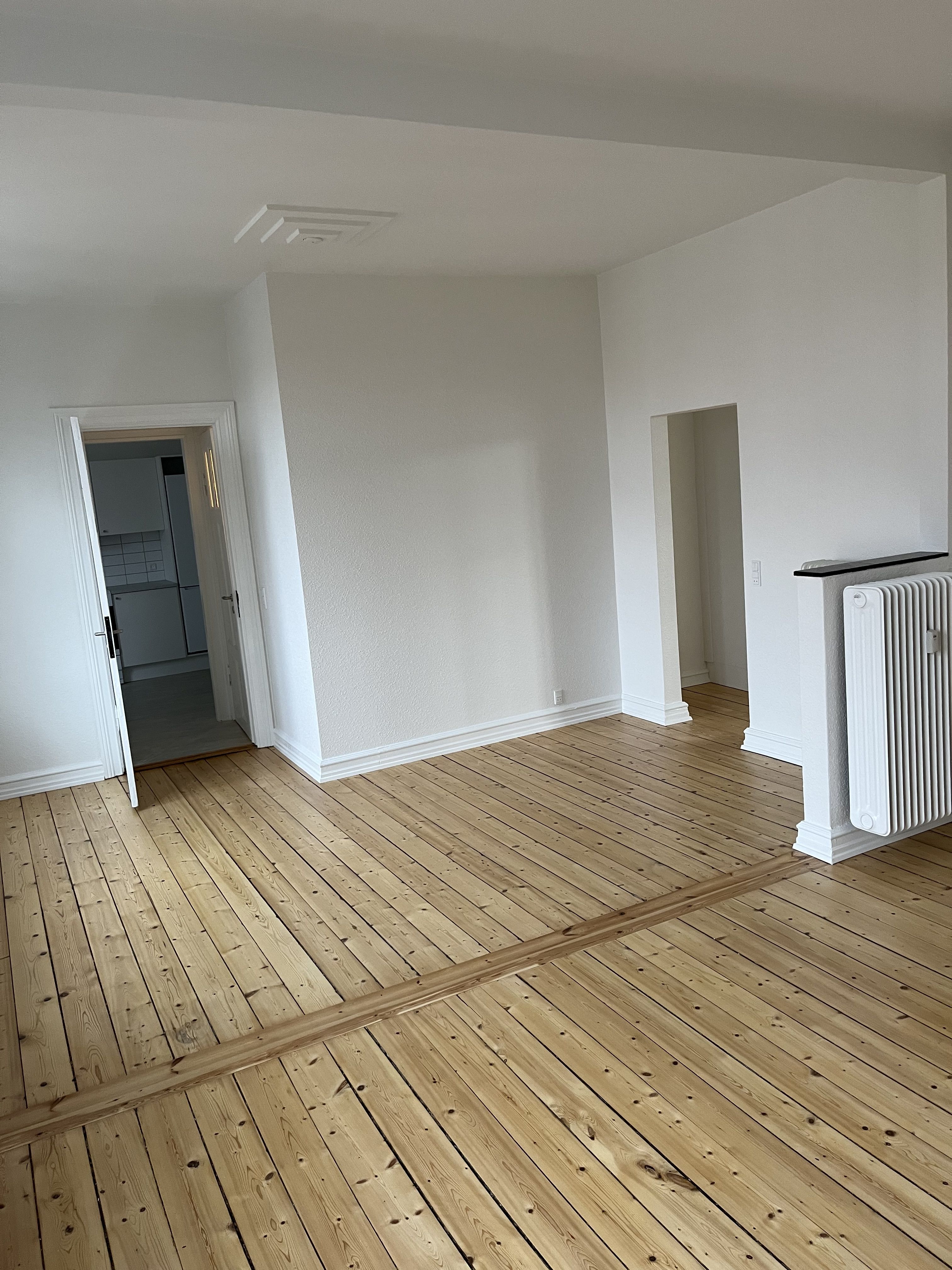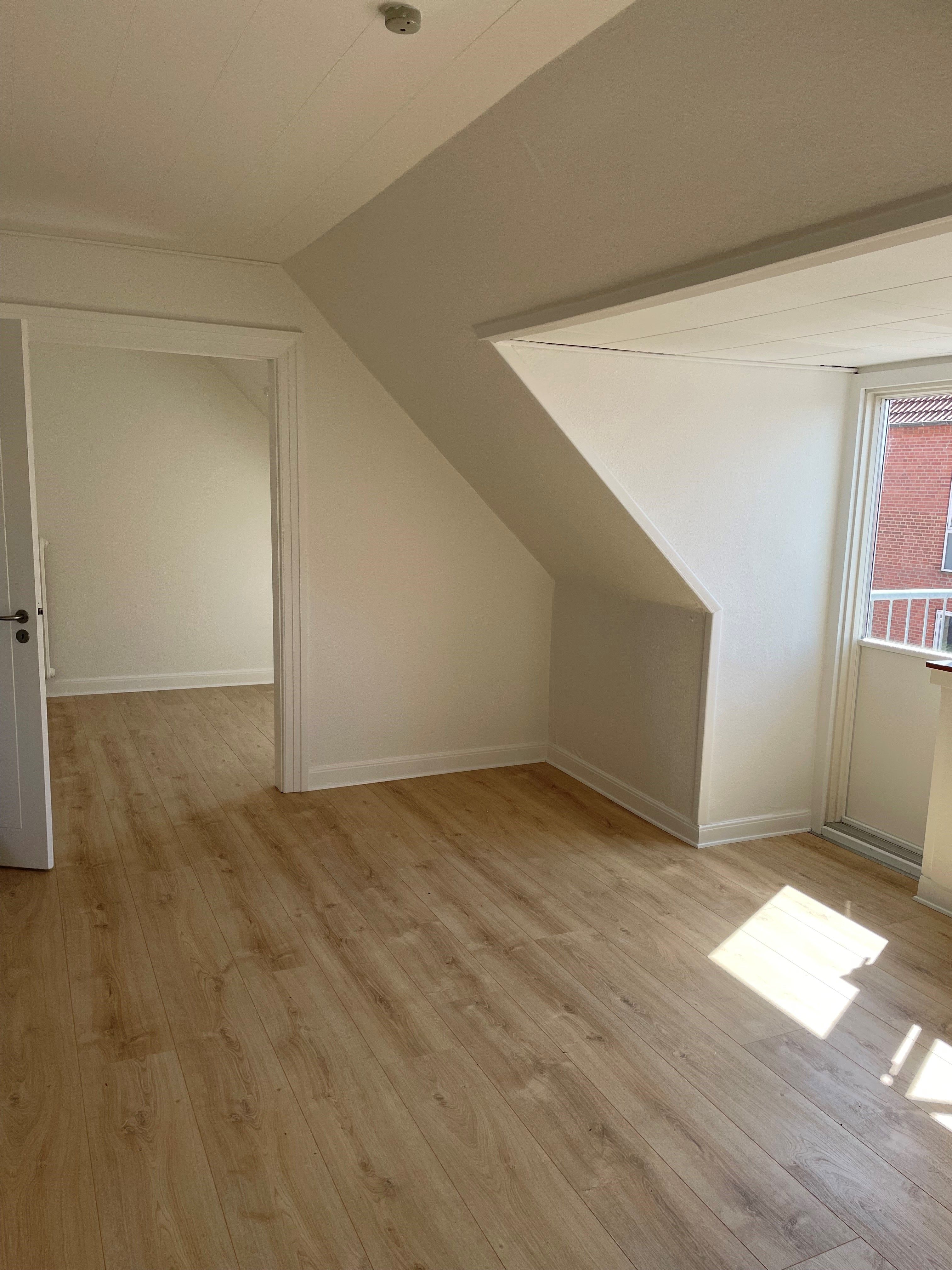 Lejligheden er lys og hyggelig med plankegulve i sæbebehandlet fyr.