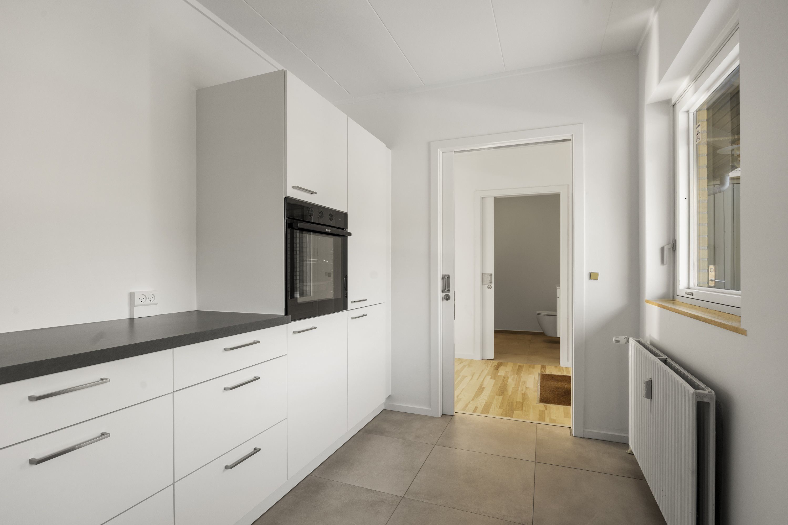 Lejligheden byder på en rummelig entré med indbyggede skabe. Herfra er der adgang til en lys og indbydende stue i åben forbindelse med et moderne køkken, som er udstyret med alle nødvendige hårde hvidevarer. Hele stueplan er med gulvvarme, hvilket sikrer et behageligt indeklima.