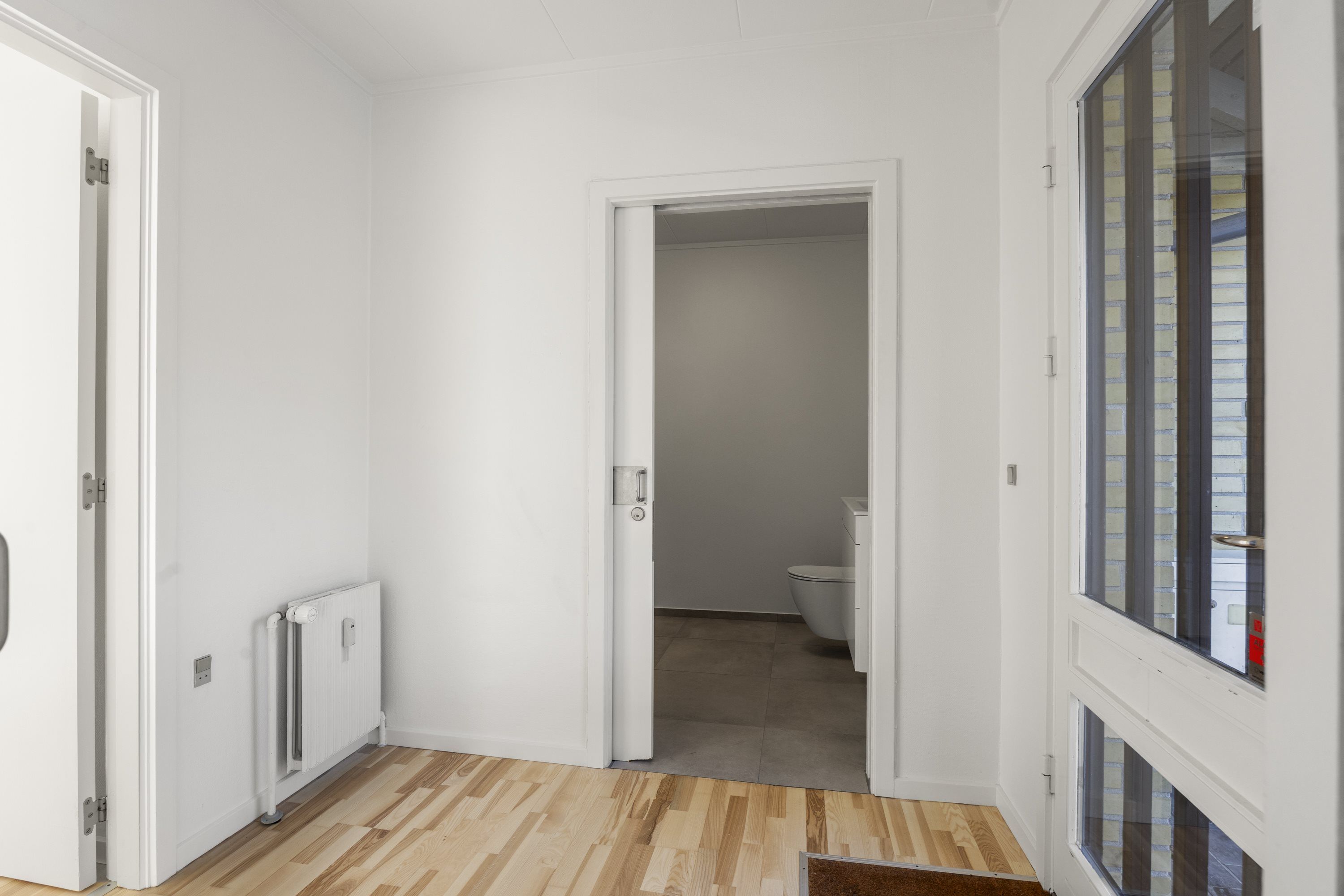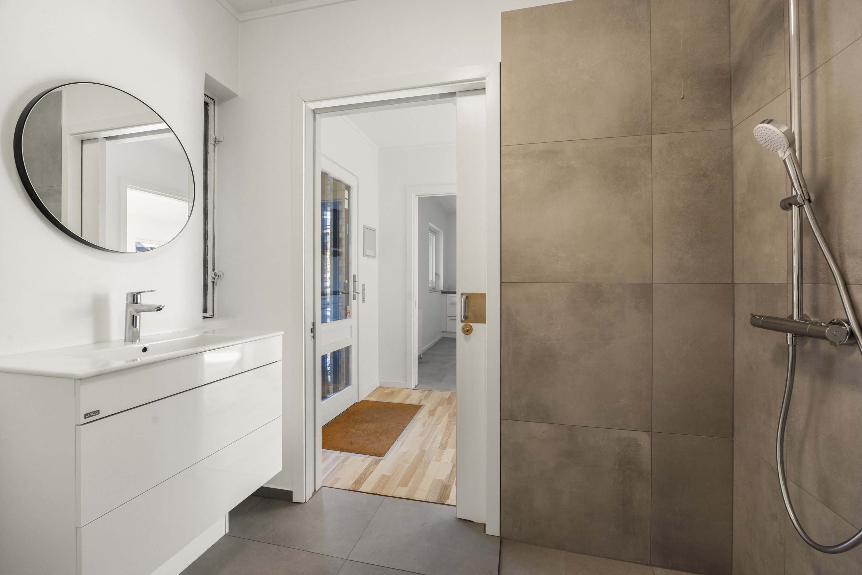 Fra stuen er der direkte udgang til en privat terrasse, hvor de rolige og grønne omgivelser kan nydes. Lejligheden indeholder desuden et stort og moderne badeværelse med separat bruseniche.