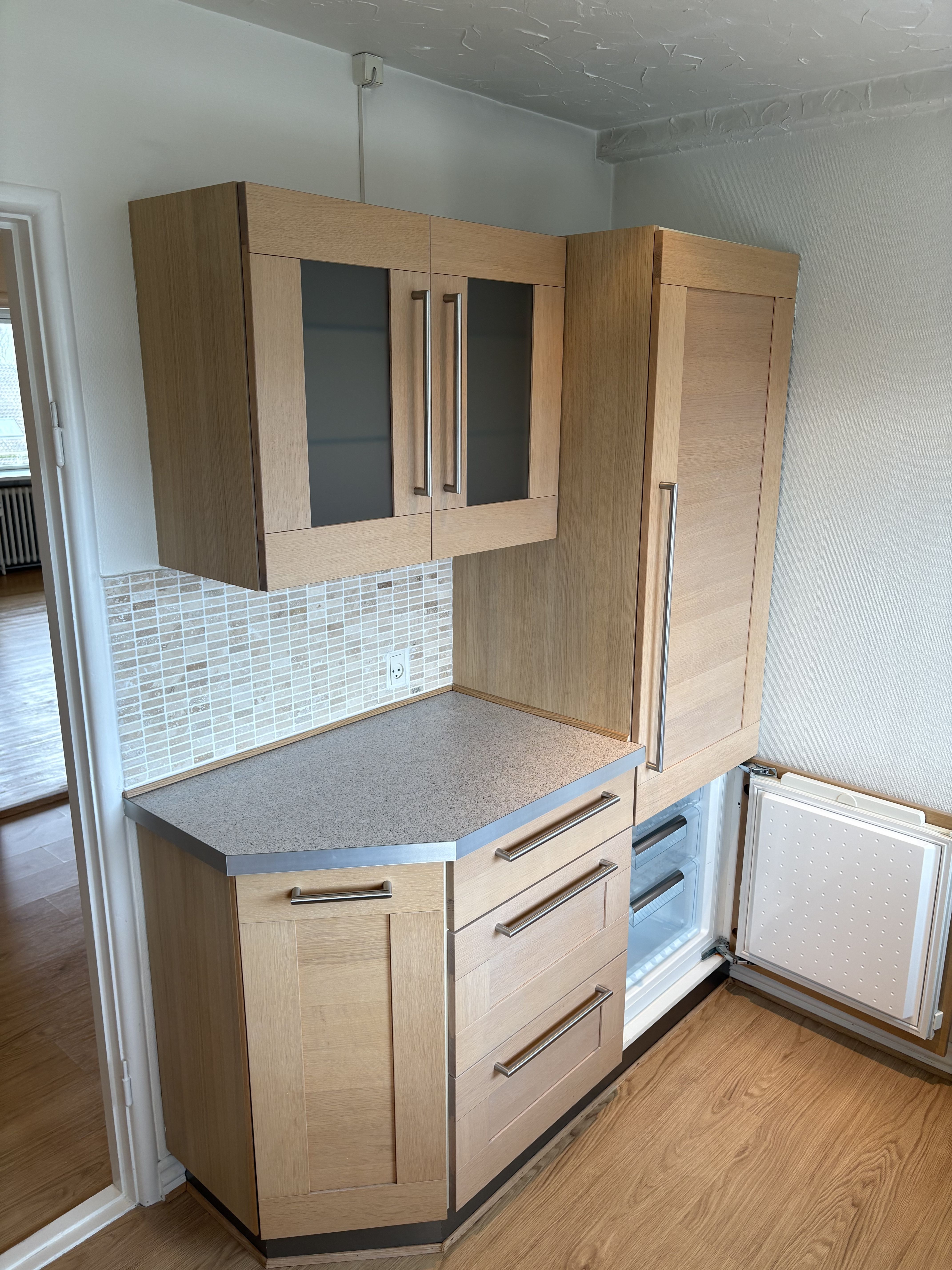 Soveværelset toner også frem med nyt tøjskab, nyslebet og nylakeret gulv. Lilleværelse med nyt tøjskab er lige etableret. På badeværelset er der bruseniche og gulvvarme under klinkerne. Køkkenet har 10-15 år på bagen men ikke ret meget brugt og er forsynet med god bordplads, vaskemaskine, lille opvaskemaskine, køle-fryseskab, emhætte, kogeplade og ovn. Entréen med kommode og garderober til overtøj og diverse ting. Sidst men ikke mindst er der sminkehjørne med spejl, knagerække og hylder.