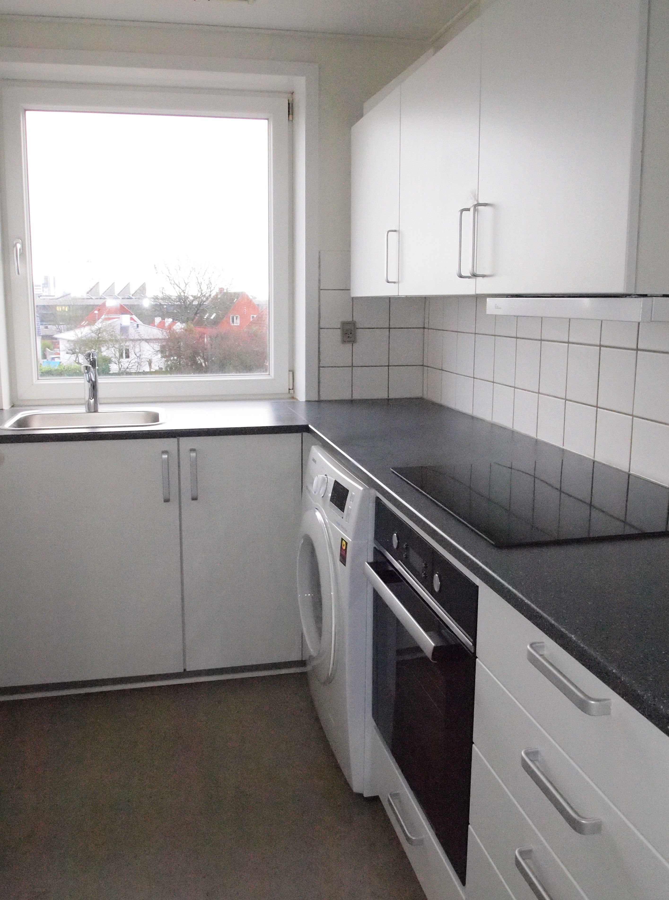 Lejemålet indeholder lille entré, nyt Kvik køkken med køle-fryseskab, indbygget ovn, glaskeramisk kogeplade og vaske-tørremaskine.