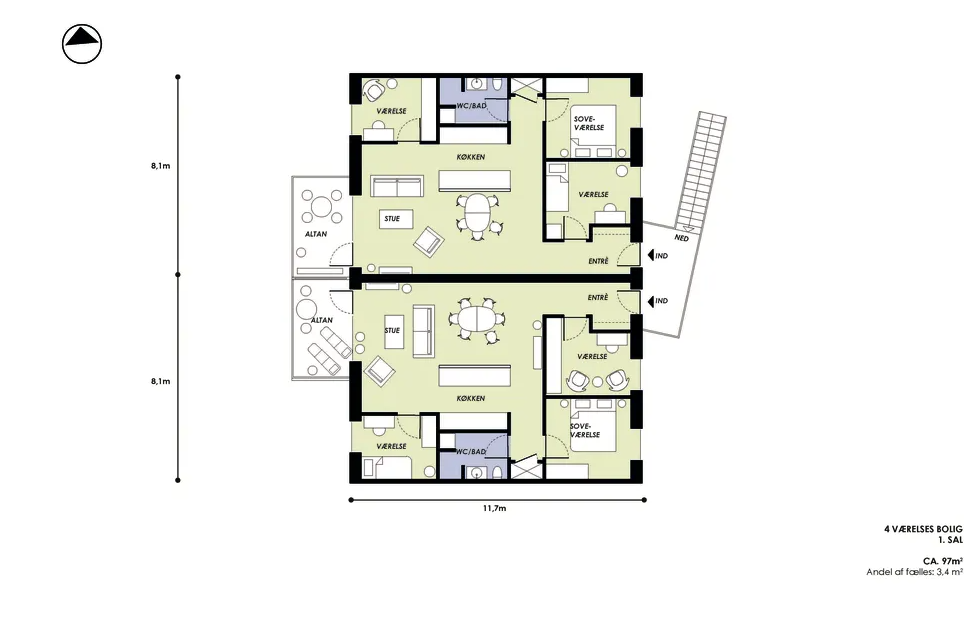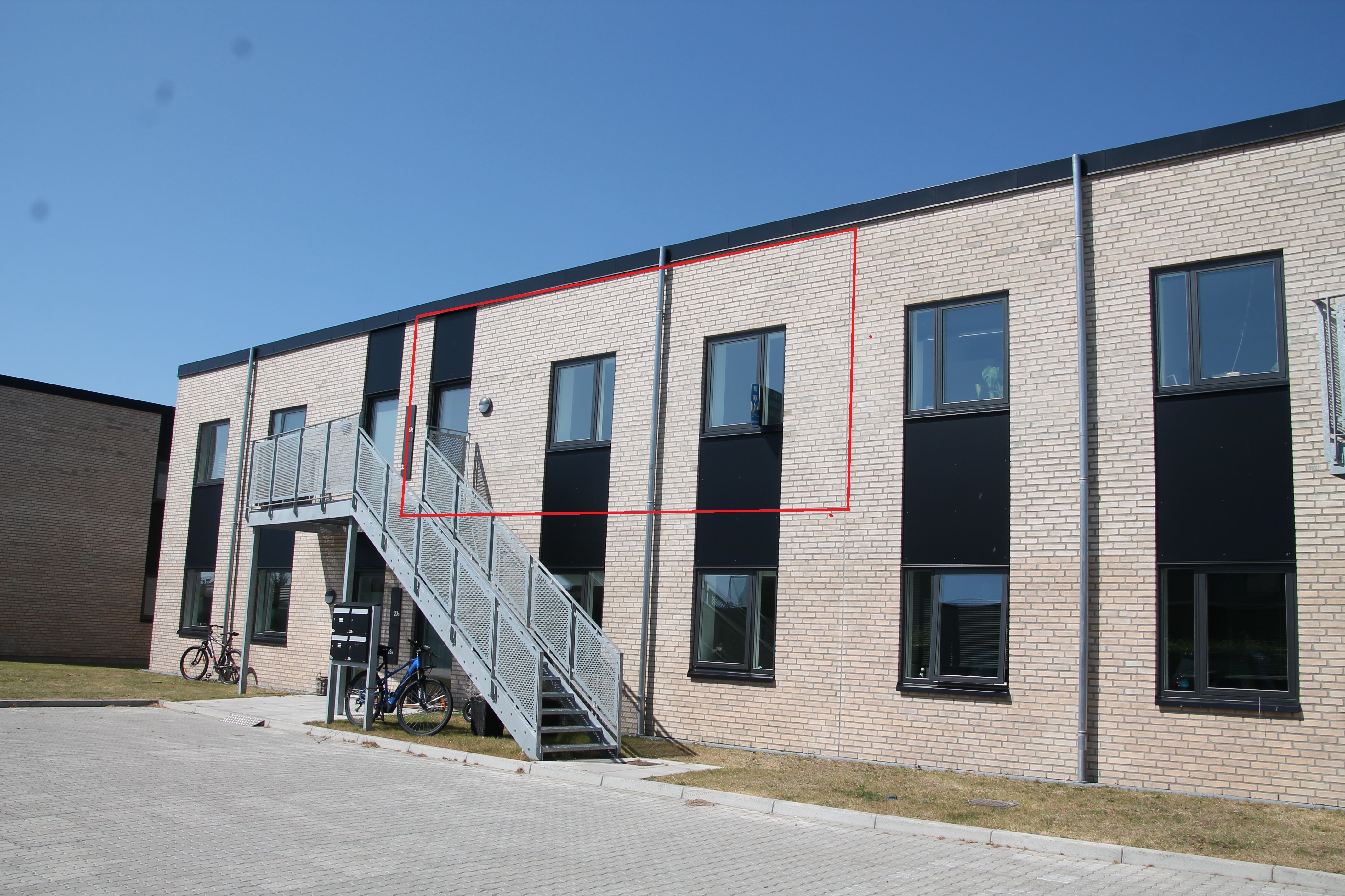 Boliger i stueetagen har adgang til en flisebelagt terrasse på ca. 15 m2. Boliger på 1. sal har egen tagterrasse på cirka 10 m2.
