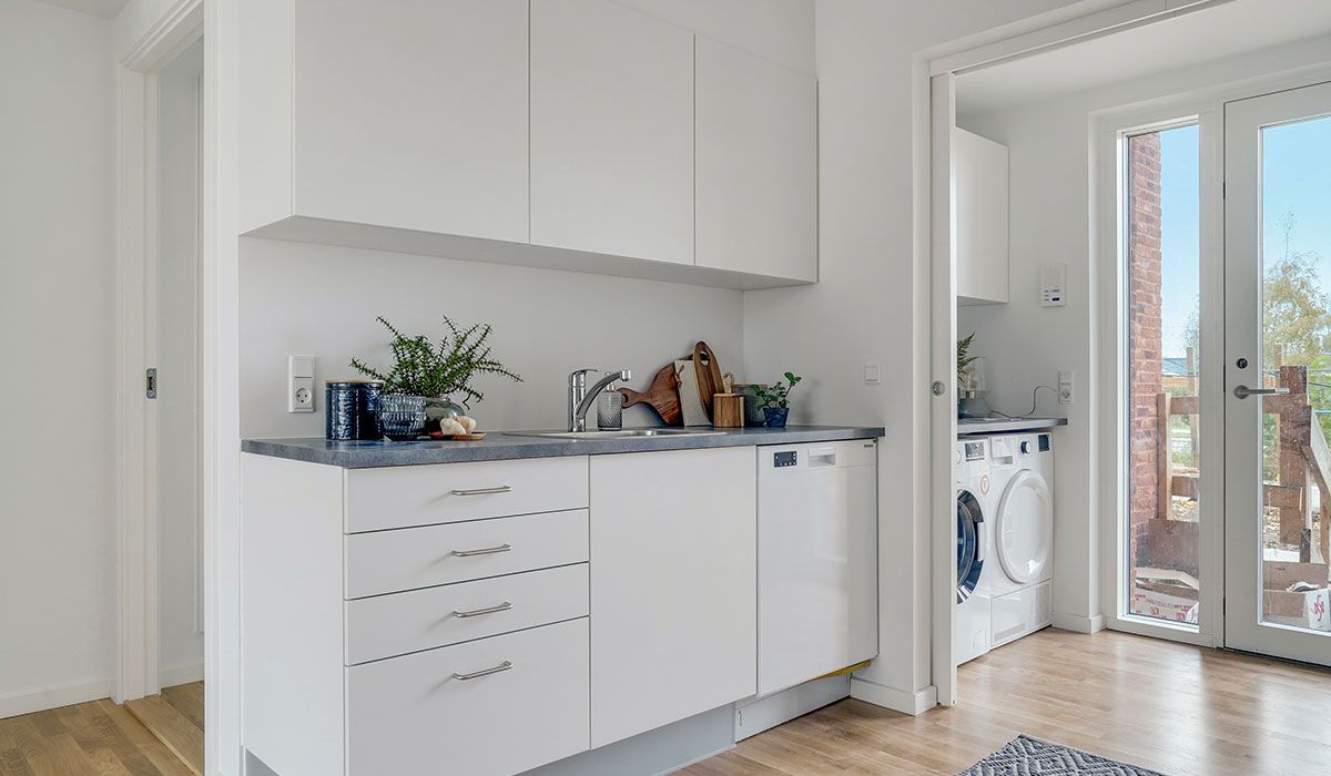 Der er alt i hårde hvidevarer herunder en kombimaskine, hvor du kan vaske og tørre tøj.