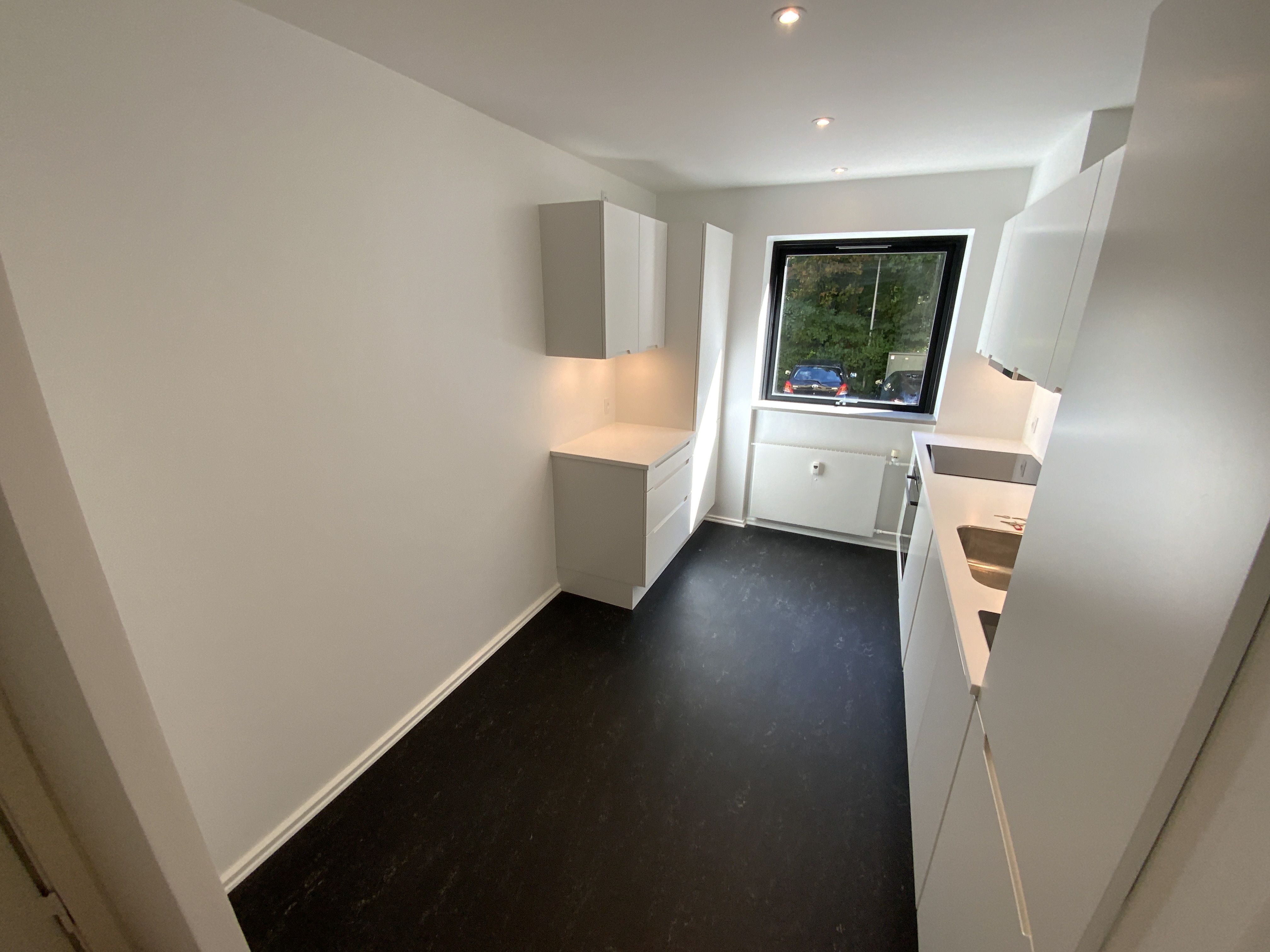 Boligen er opdelt i 2 etager. Stueetagen fremstår rummelig og indbydende og består af 2 soveværelser samt et badeværelse. Værelserne har en god størrelse hvilket giver en masse forskellige indretnings- og anvendelsesmuligheder. Værelserne er alle udstyret med store velplacerede vinduer og/eller franske døre som sikrer et suverænt naturligt lys. Badeværelset fremstår lyst og rummeligt med hvide vægge og hvide vægfliser i bruser, samt en lysegrå sten på gulvet som giver en flot kontrast. Badeværelset er udstyret med funktionelt underskab med to skuffer og væghængt toilet. Badeværelset er ydermere udstyret med vaskemaskine og tørretumbler fra Siemens. Boligens entre er rummelig og med god plads til opbevaring i de indbyggede skabe. Der er installeret spots i loftet som sikrer tilstrækkelig belysning. Trappen i entreen fører op til boligens 1.sal. 1\. salen består af et stort lyst køkkenalrum med direkte adgang til lejlighedens dejlige altan. Altanen inviterer til utallige hyggestunder i solen. Fordi der er direkte udgang fra stuen til altanen, er den i de varme måneder, praktisk talt en forlængelse af boligens i forvejen store stue. Køkkenet er moderne med mørke bordplader og sandfarvede fronter og er indrettet med køkken ø med vask, som sikrer god plads og mulighed for kulinariske udfoldelser. Den åbne planløsning sikrer samvær under madlavning, så hyggestunder ikke skal afbrydes af madlavning. Køkkenet er i øvrigt indrettet med opvaskemaskine, ovn, kogezone, køleskab, fryser og emhætte. Ejendommen er i øvrigt udstyret med en stor fællesterrasse som er ideel til større sammenkomster. Der er tilhørende depotrum til lejligheden.