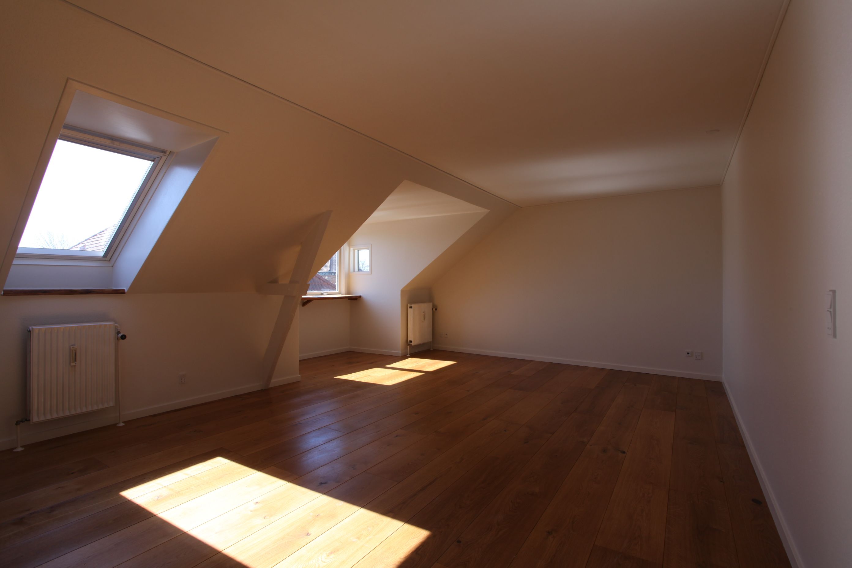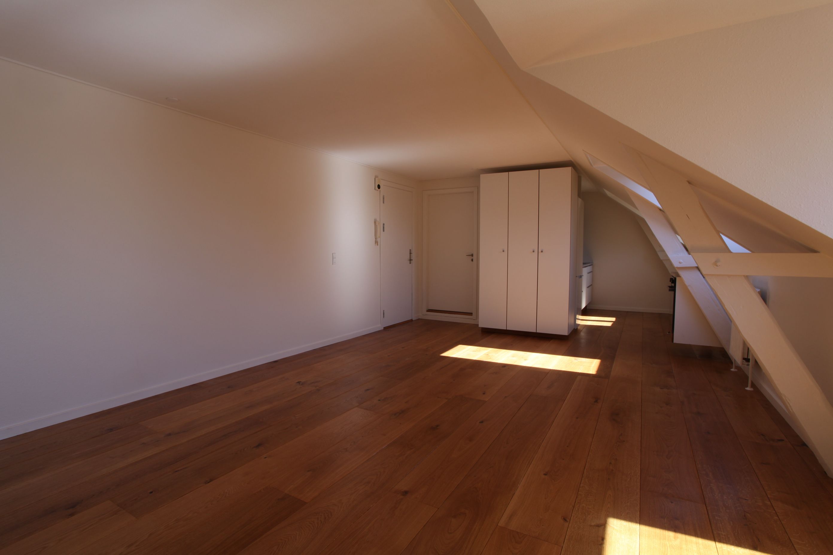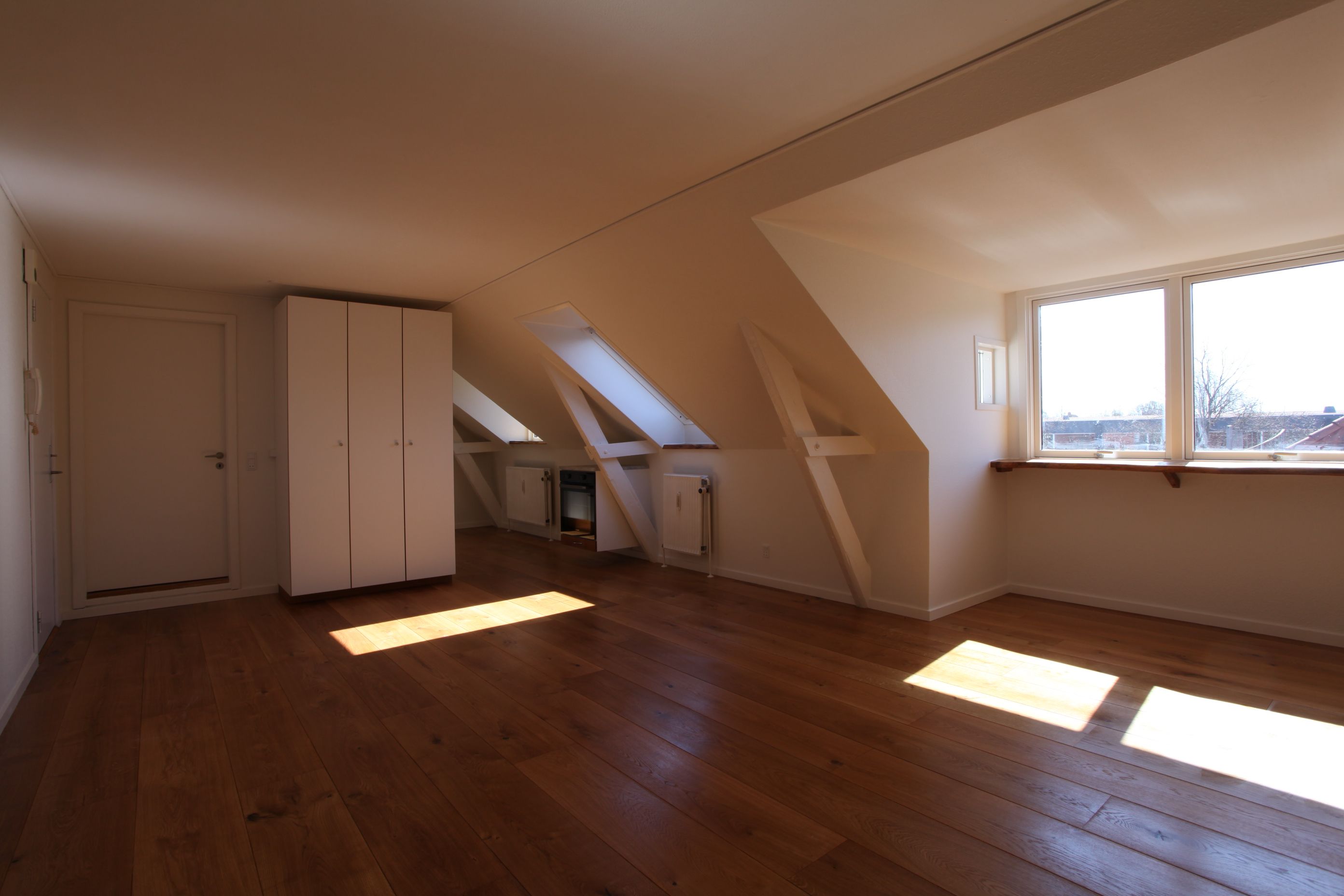 Lys og flot 1-værelseslejlighed i velbeliggende ejendom i Hammel. Sydvendt facade. I hele lejligheden findes brede gulve i massiv eg. Nyt badeværelse med gulvvarme og flot nyt køkken. Adgang til stor tagterrasse med udsigt til bl.a. kirketårnet og den gamle bank.