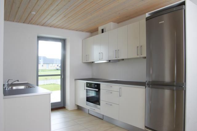 Denne lejlighed indeholder et kombineret køkken-alrum og stue med store vinduespartier fra gulv til loft, som giver et godt lysindfald. Det lyse køkken er fra HTH og indeholder induktionskogeplade, opvaskemaskine, emhætte, køle-/fryseskab og ovn med pyrolyse-renseprogram.