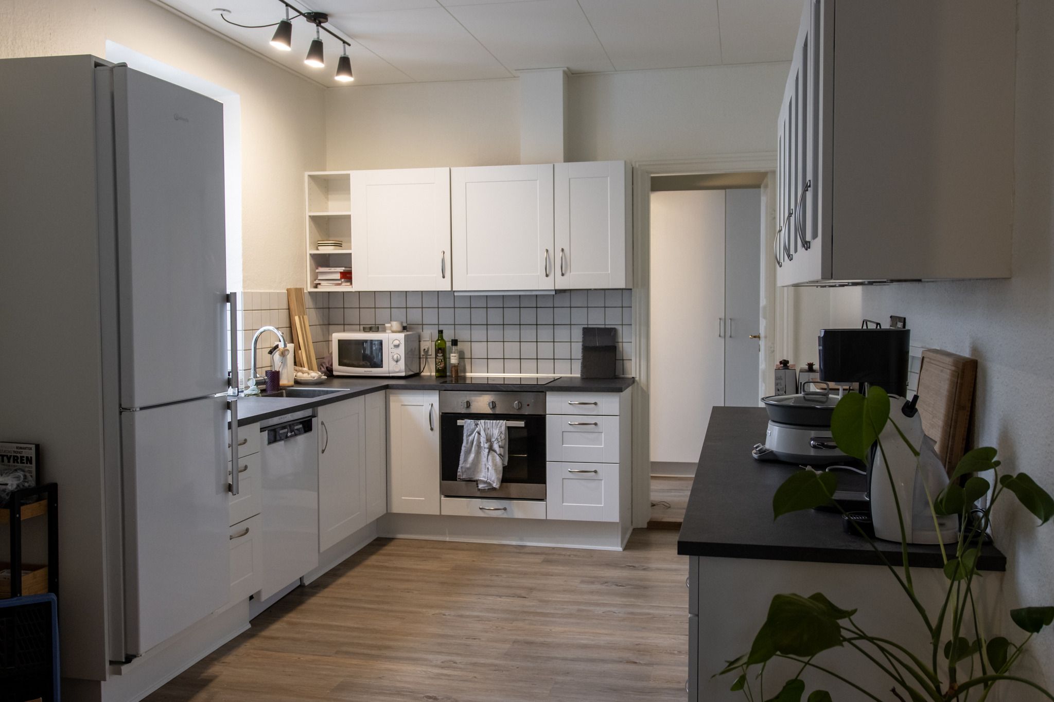 Stuerne er alle åbne og rummelige, og giver fine muligheder for at lege med møbler og indretningsdetaljer. Lejlighedens køkken er nyere fra 2020, med hvide elementer og mørke bordplader, og her er et tilstødende viktaulierum ved siden af. Badeværelset er ligeledes nyt fra 2020, også i hvid, og med messing greb og glas brusevæg.