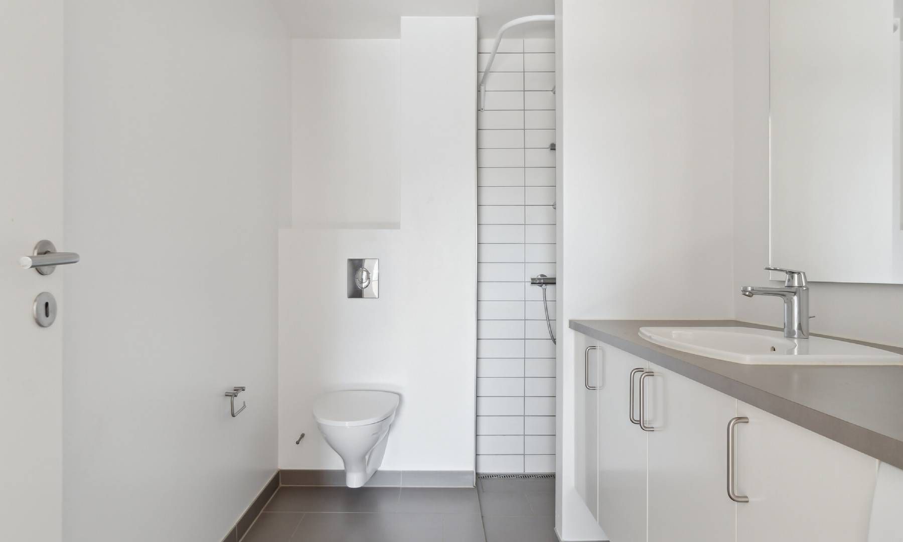 På det moderne badeværelse har du egen vaskesøjle og bruseniche med både overhead og håndholdt bruser.