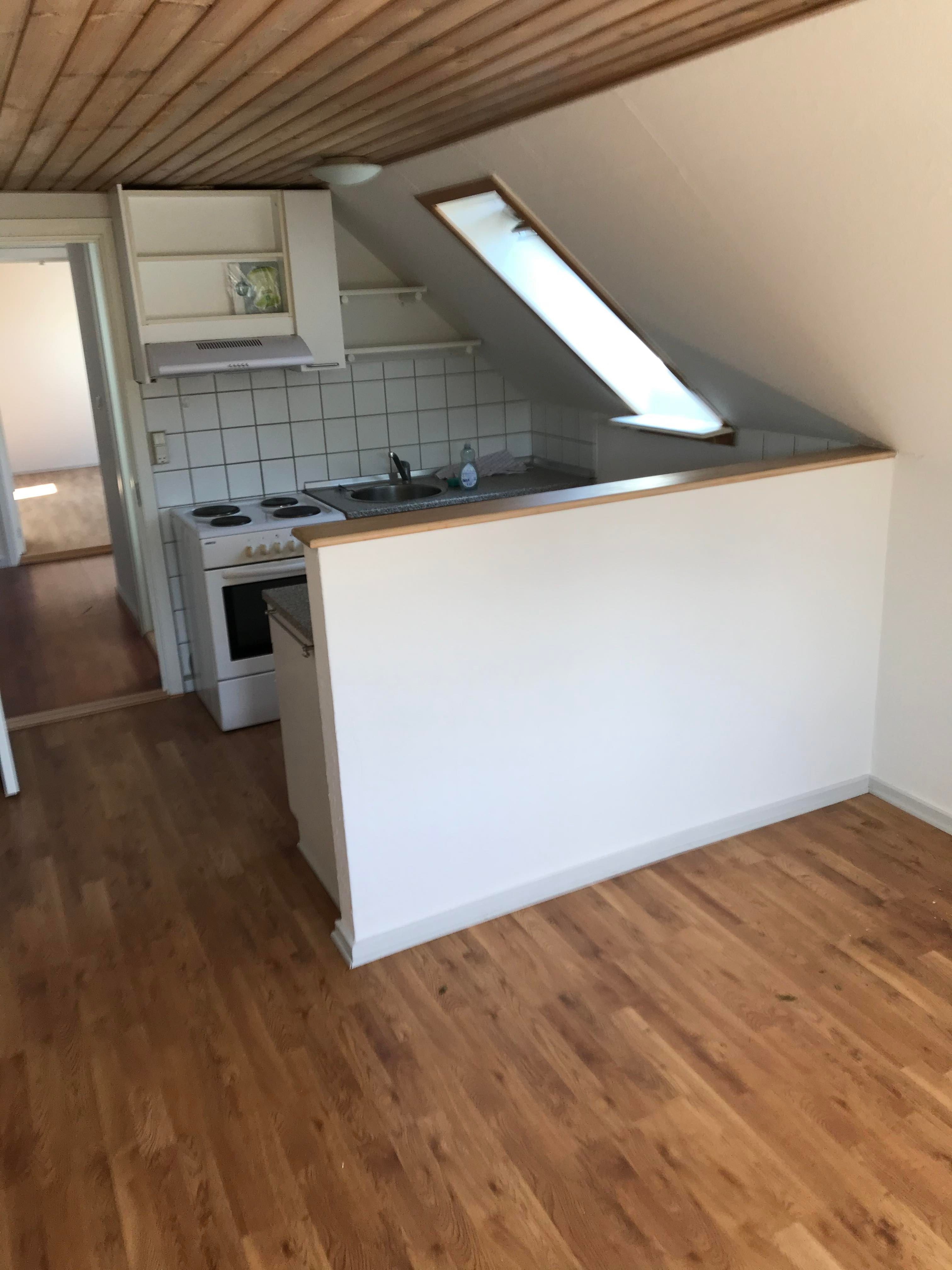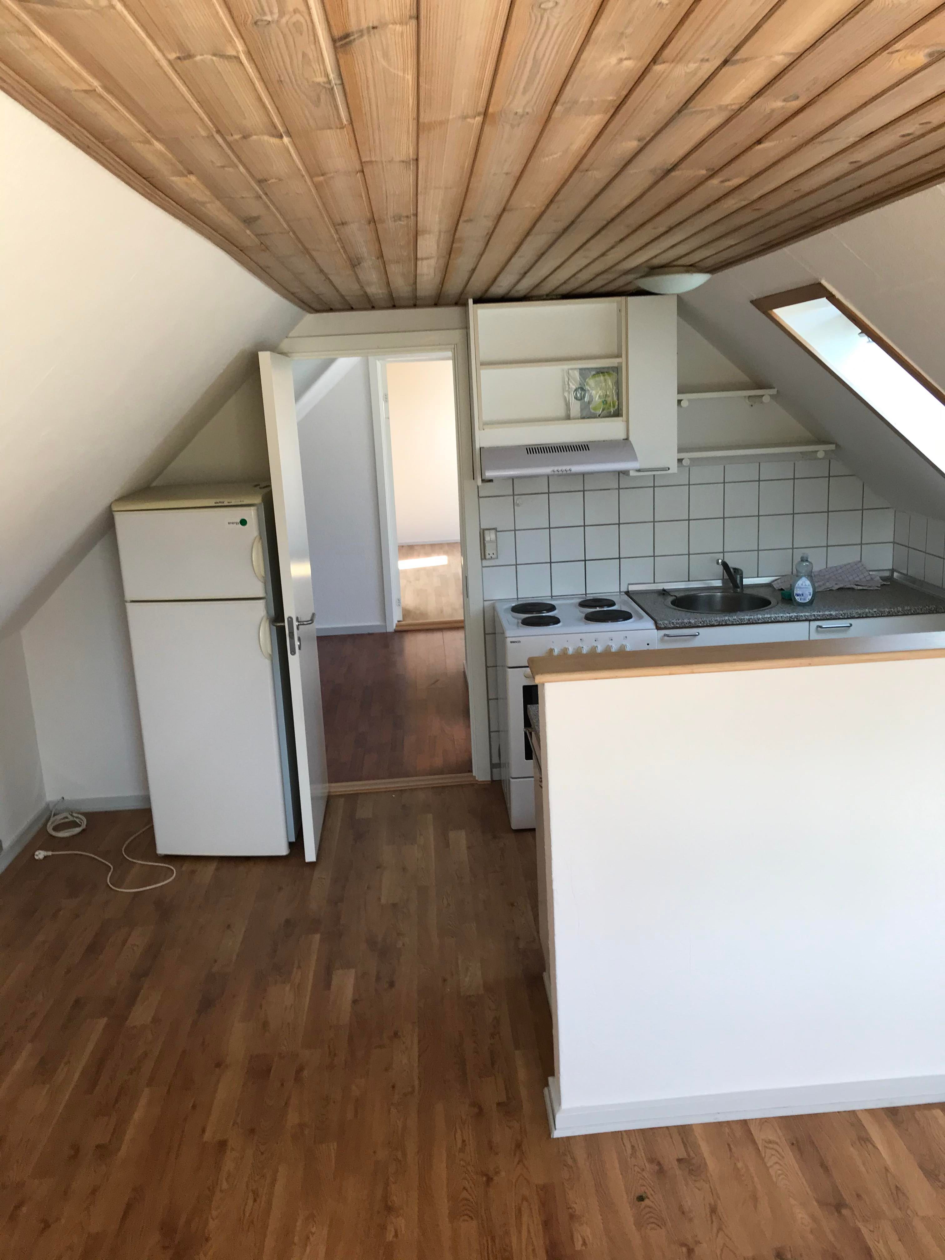 Fra stuen er der adgang til værelse og her fra til et køkken med køleskab.