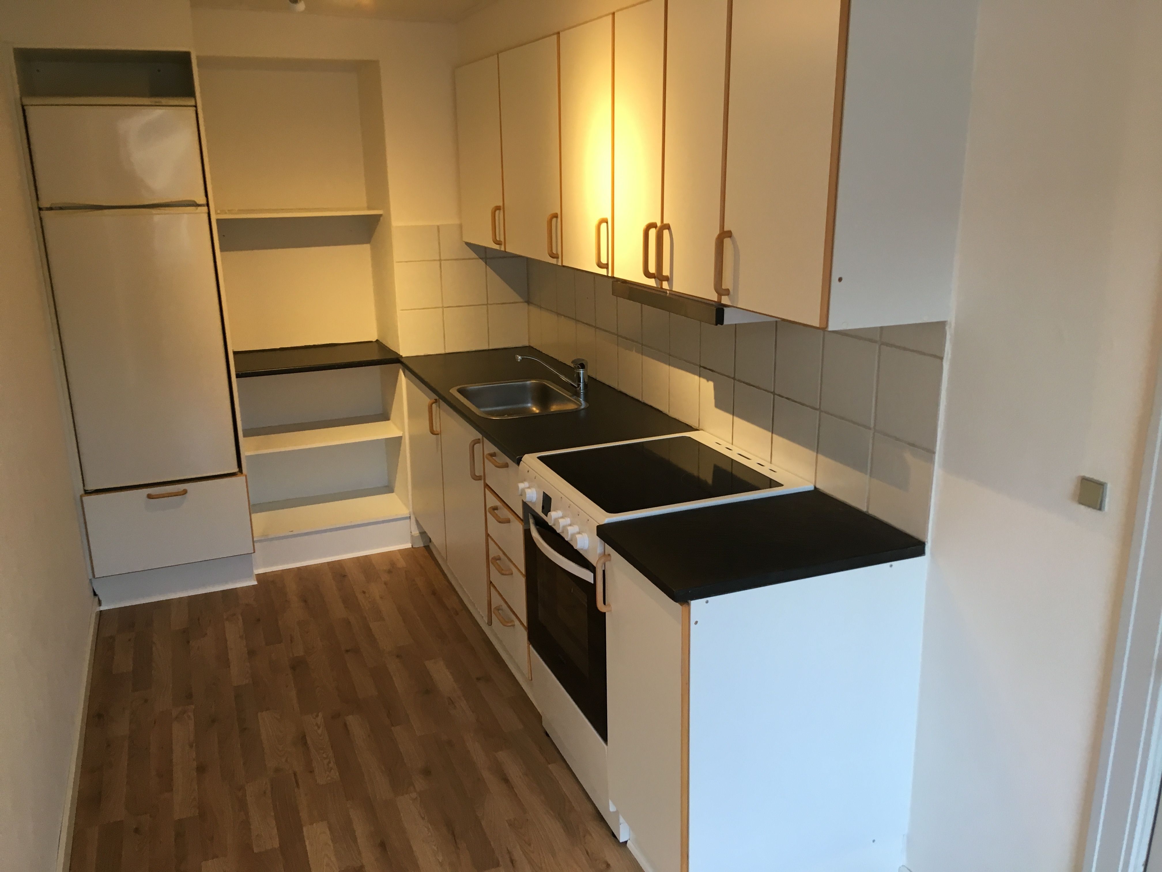 komfur, emhætte og køleskab.